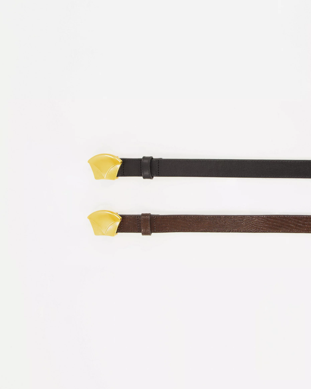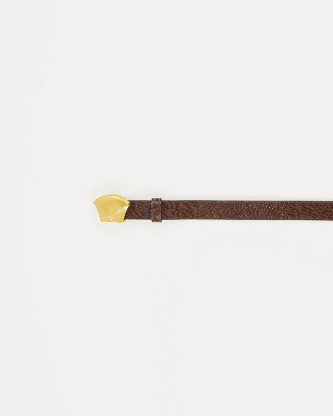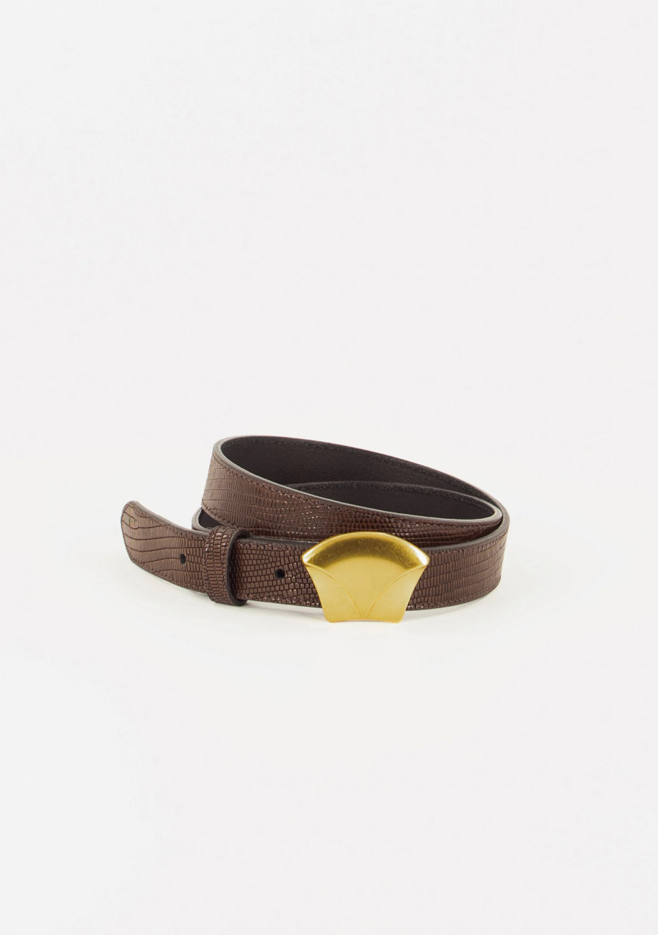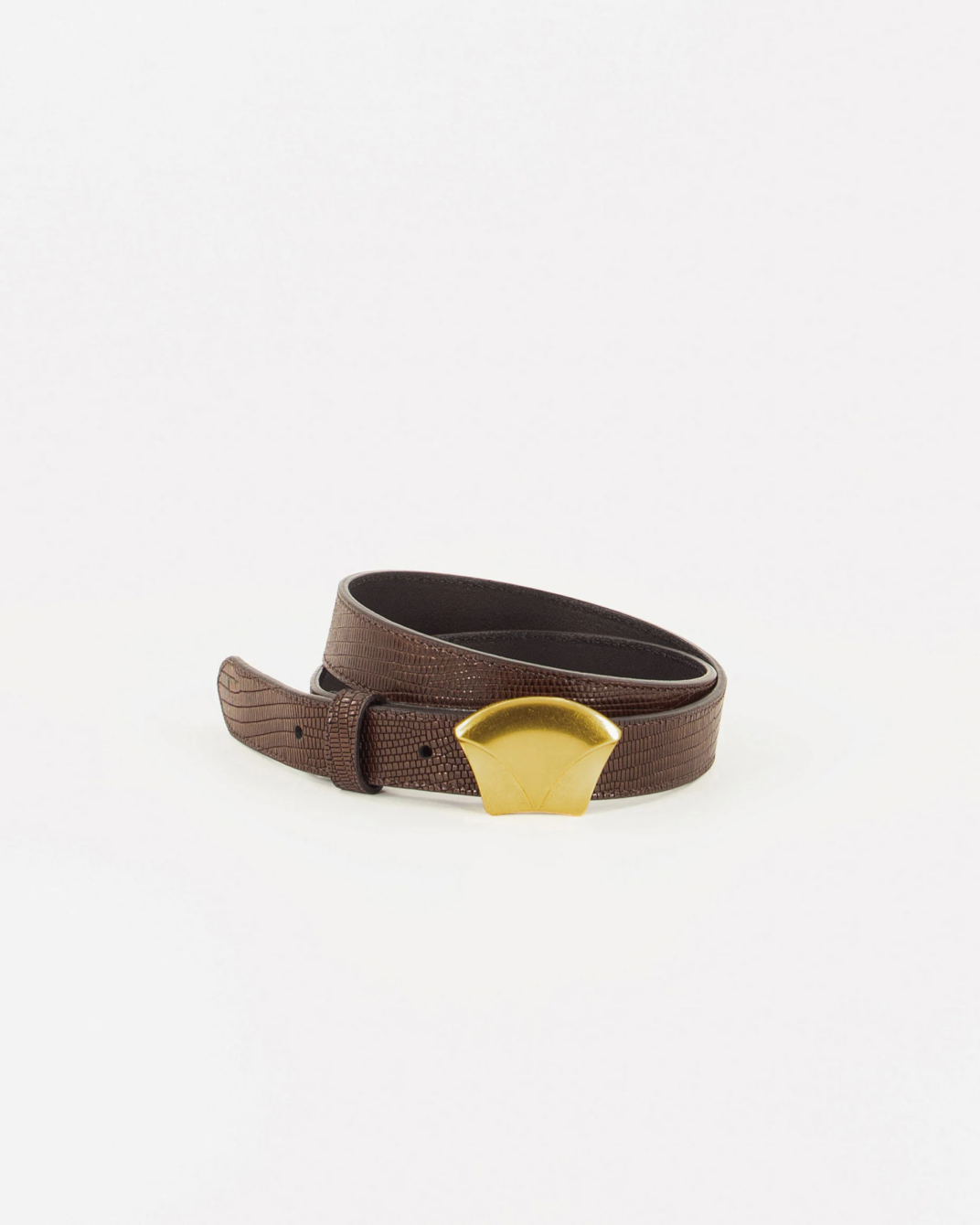 Cinturón Diviluz Sessùn. Cinturón de piel con estampado tipo lagarto en marrón chocolate, con hebilla distintiva de Sessùn en dorado.