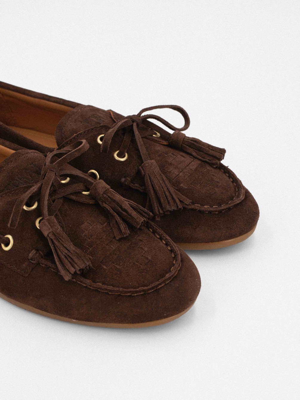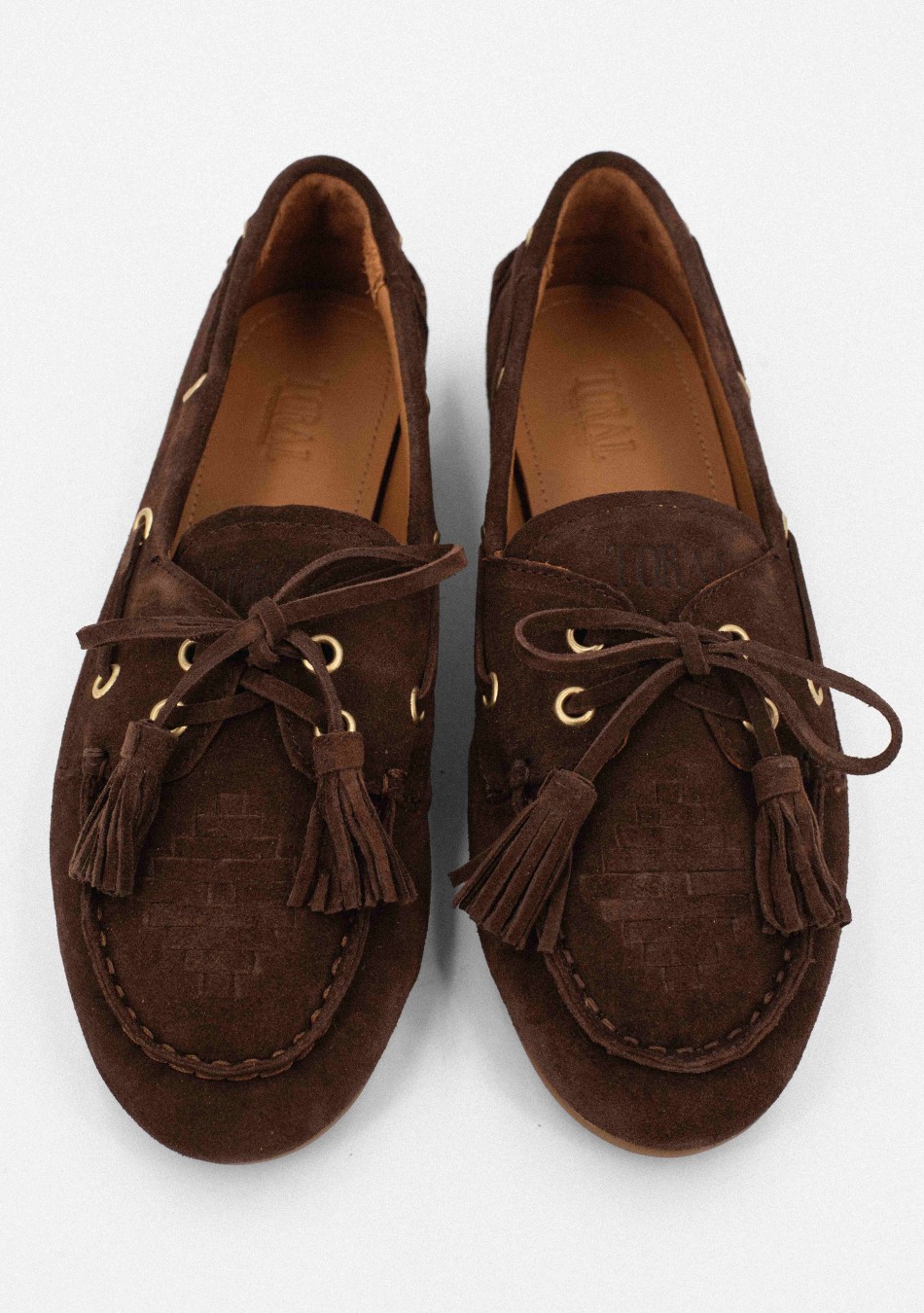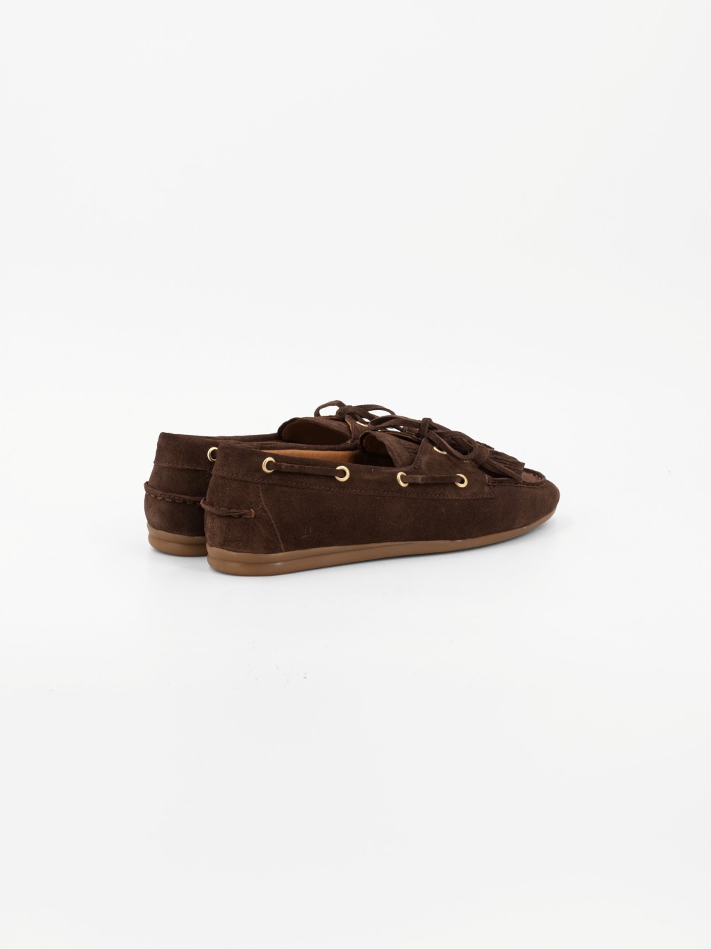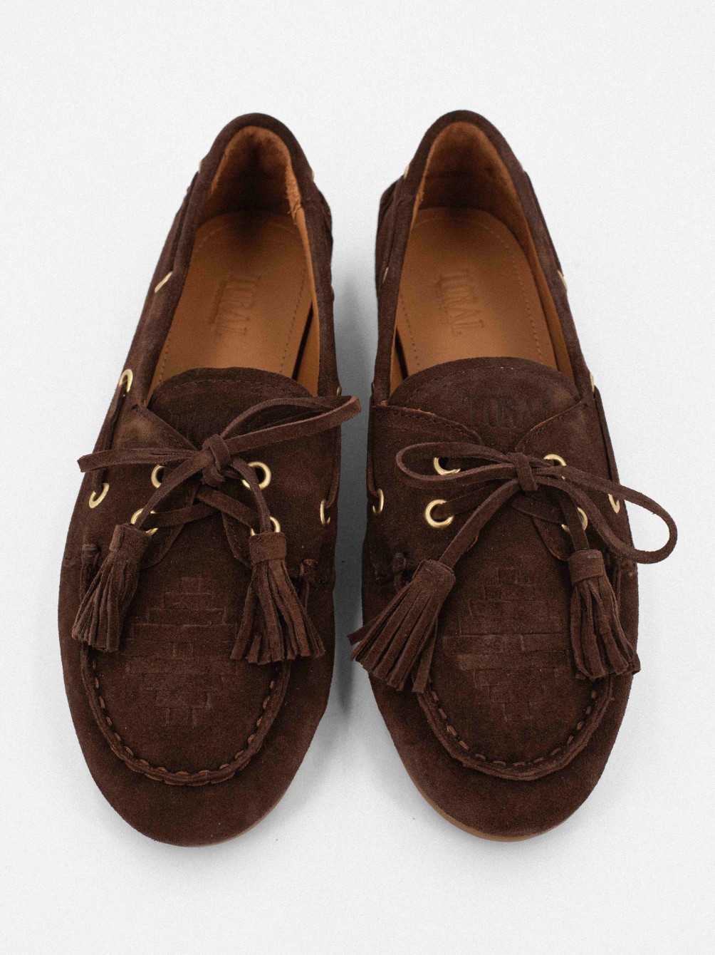 Mocasín de piel con punta redonda, costuras en contraste y detalles de encaje dorado. Forro y plantilla de piel. Suela de goma flexible y ligera.