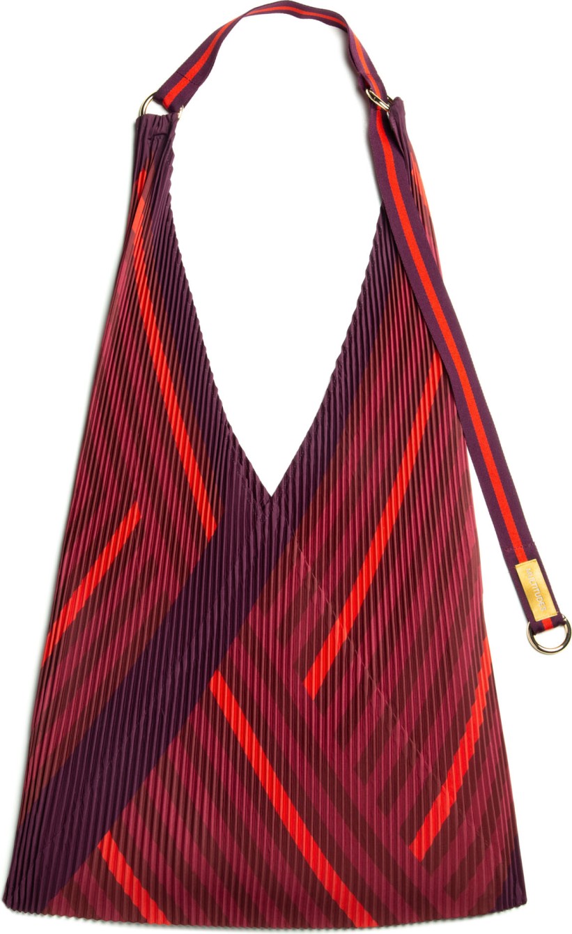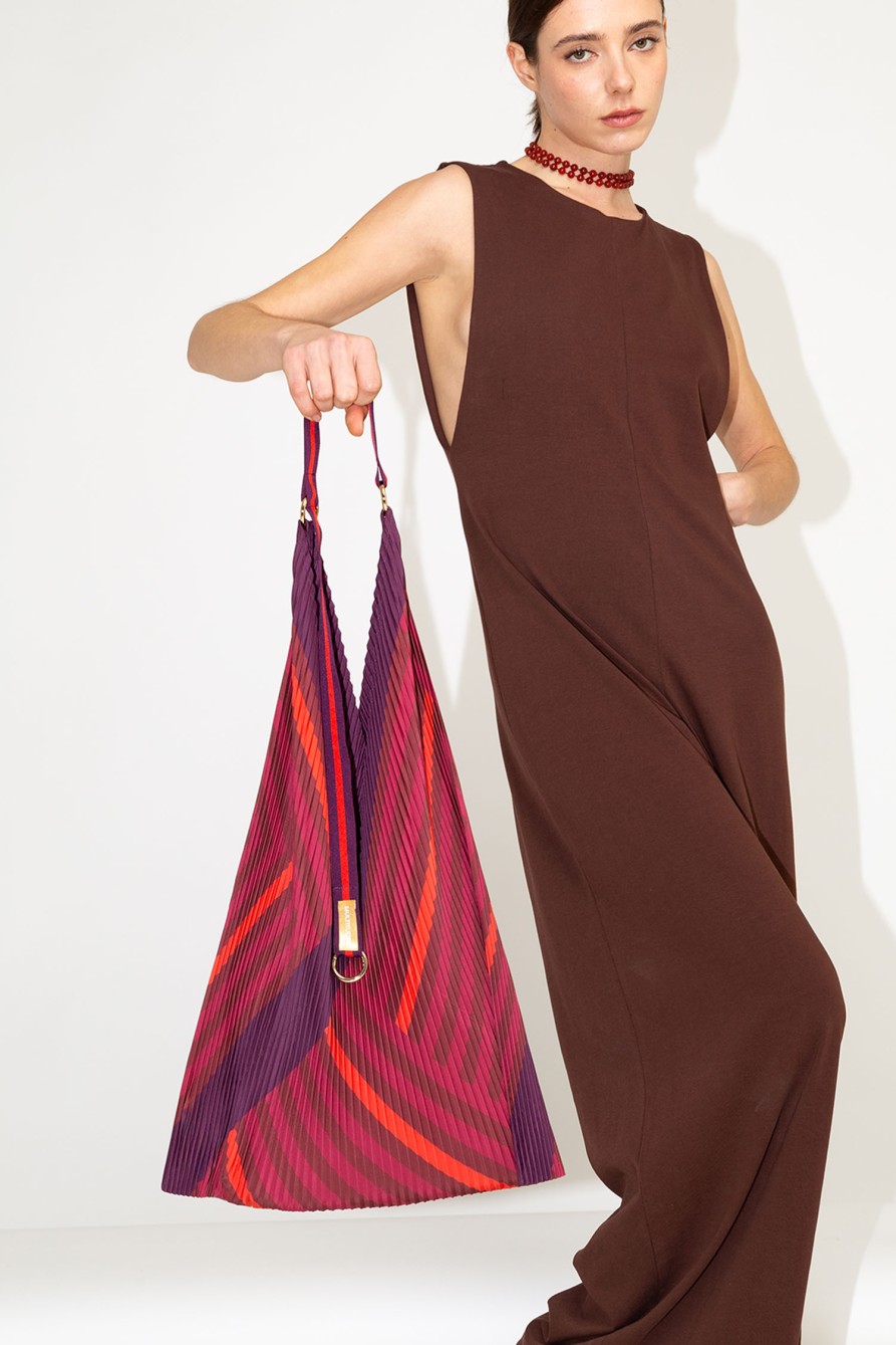 Bolso confeccionada en tejido reciclado plisado con un asa de cinta en contraste de la que cuelga otra cinta con anilla de mosquetón en el extremo para colgar el pouch Multitudes o las llaves.