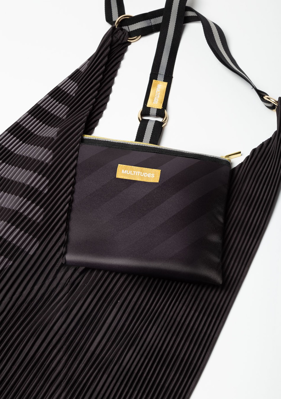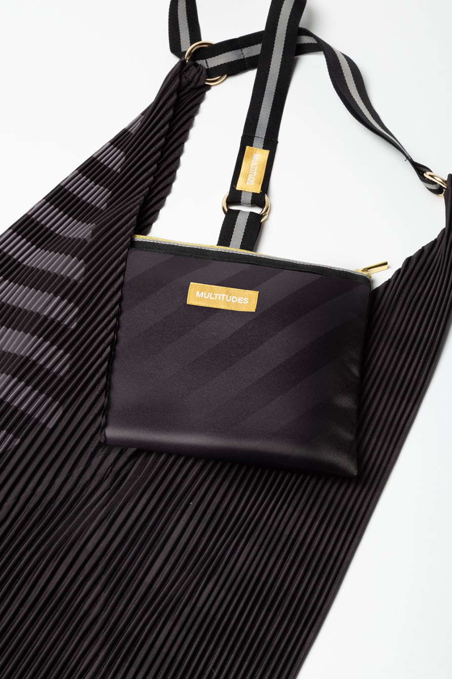 Bolso confeccionada en tejido reciclado plisado con un asa de cinta en contraste de la que cuelga otra cinta con anilla de mosquetón en el extremo para colgar el pouch Multitudes o las llaves.