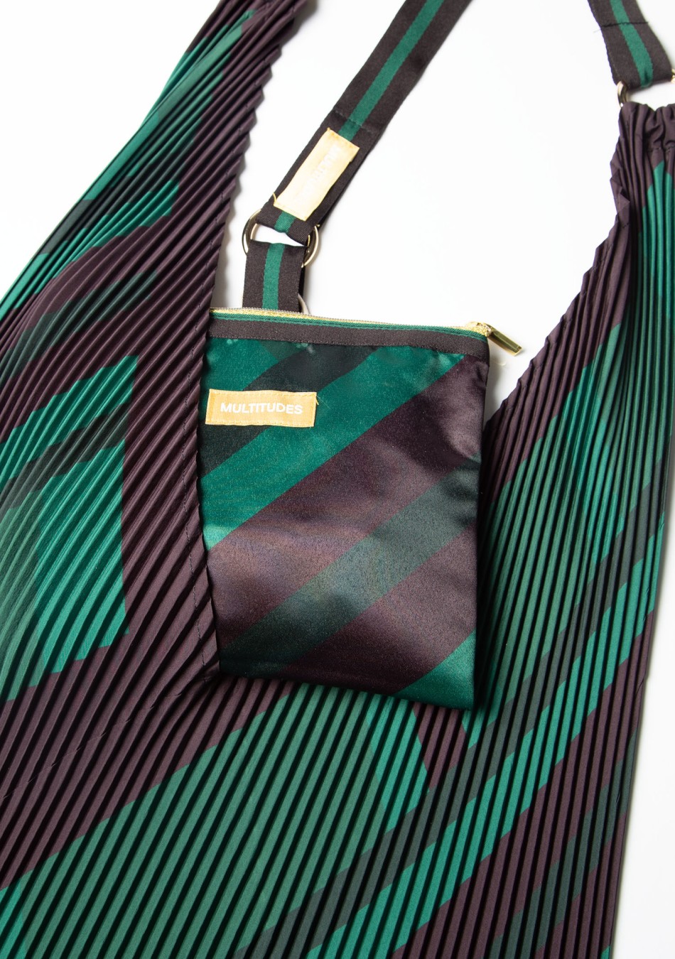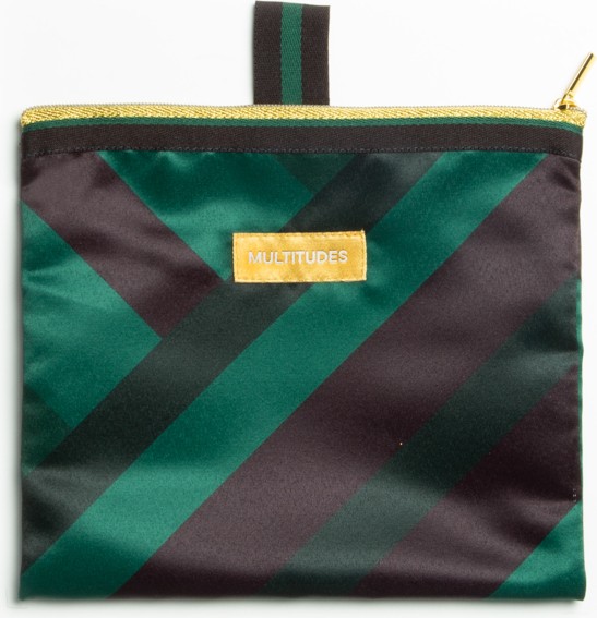 Mini bolso confeccionado en poliéster reciclado sedoso. Cierre con cremallera dorada en contraste. Pequeño lazo para poder engancharlo a tu bolso Multitudes