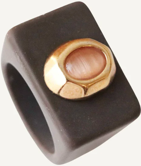 Anillo artesanal hecho en España, elaborado en resina recubierta de arcilla polimérica con acabado lacado protector, pieza dorada con baño de oro de 18 quilates y piedra natural de ónix.