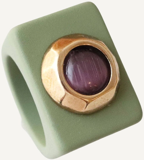 Anillo artesanal hecho en España, elaborado en resina recubierta de arcilla polimérica con acabado lacado protector, pieza dorada con baño de oro de 18 quilates y piedra natural de selenita lila .