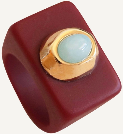 Anillo artesanal hecho en España, elaborado en resina recubierta de arcilla polimérica con acabado lacado protector, pieza dorada con baño de oro de 18 quilates y piedra natural de ónix.