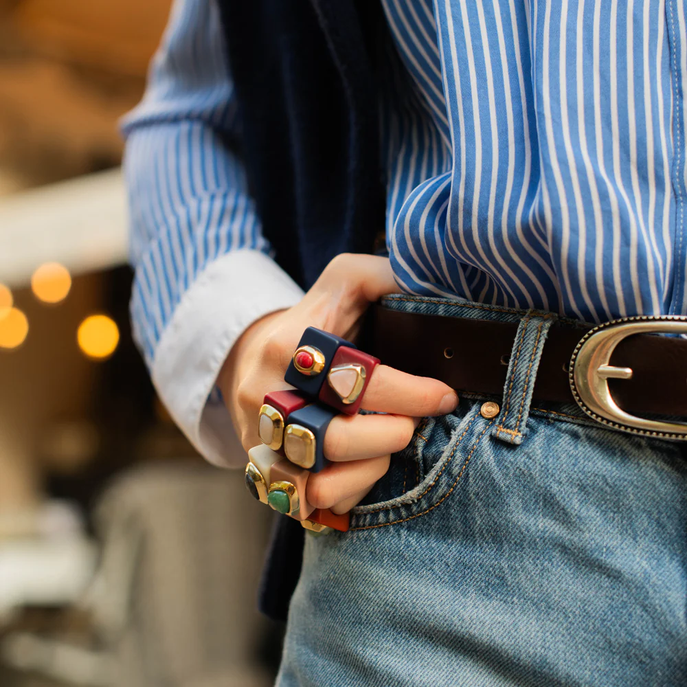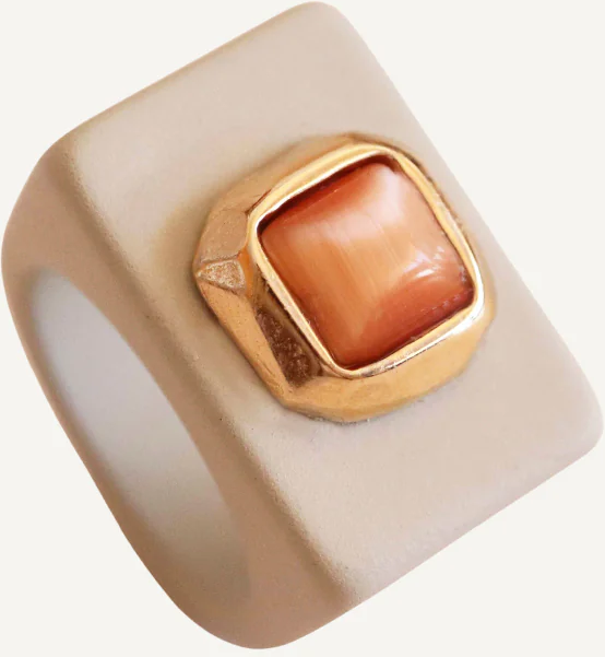 Anillo artesanal hecho en España, elaborado en resina recubierta de arcilla polimérica con acabado lacado protector, pieza dorada con baño de oro de 18 quilates y piedra natural de selenita naranja.