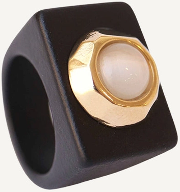 Anillo artesanal hecho en España, elaborado en resina recubierta de arcilla polimérica con acabado lacado protector, pieza dorada con baño de oro de 18 quilates y piedra natural de ónix.