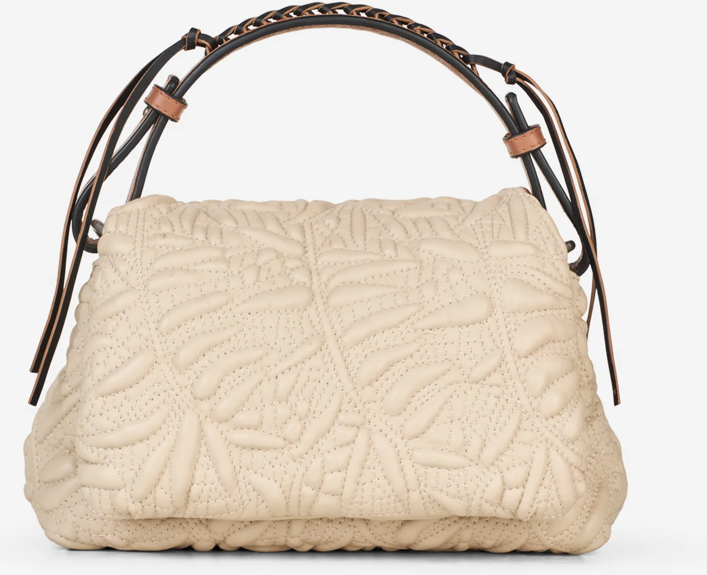 Bolso de piel super suave con dibujo en relieve de flores acolchado. Correa corta de piel extraíble con detalles de trenzado y un asa más larga ajustable.