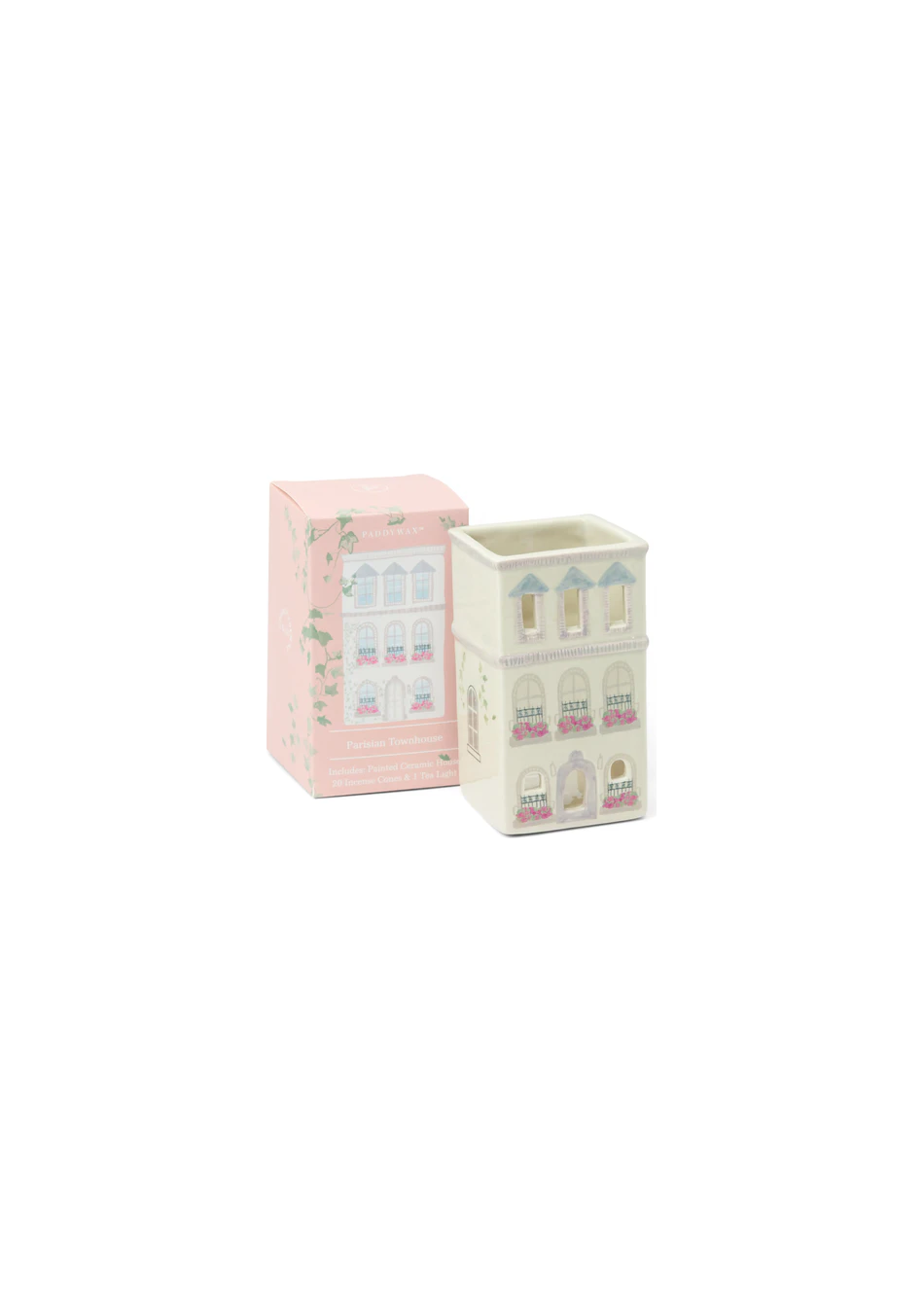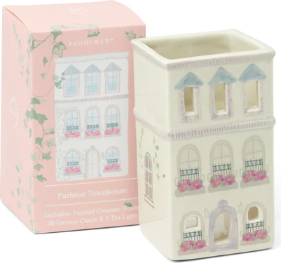 Portaincienso y portavelas pintado a mano. Su diseño permite que el humo del incienso salga por la parte trasera y que la luz de la vela se filtre a través de las ventanas, creando un ambiente cálido y acogedor.