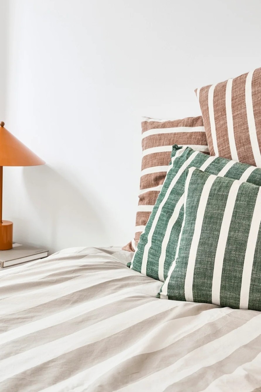 Cojín cuadrado en algodón 100% OEKO-Tex, con estampado de rayas y color natural que aporta calma y serenidad.