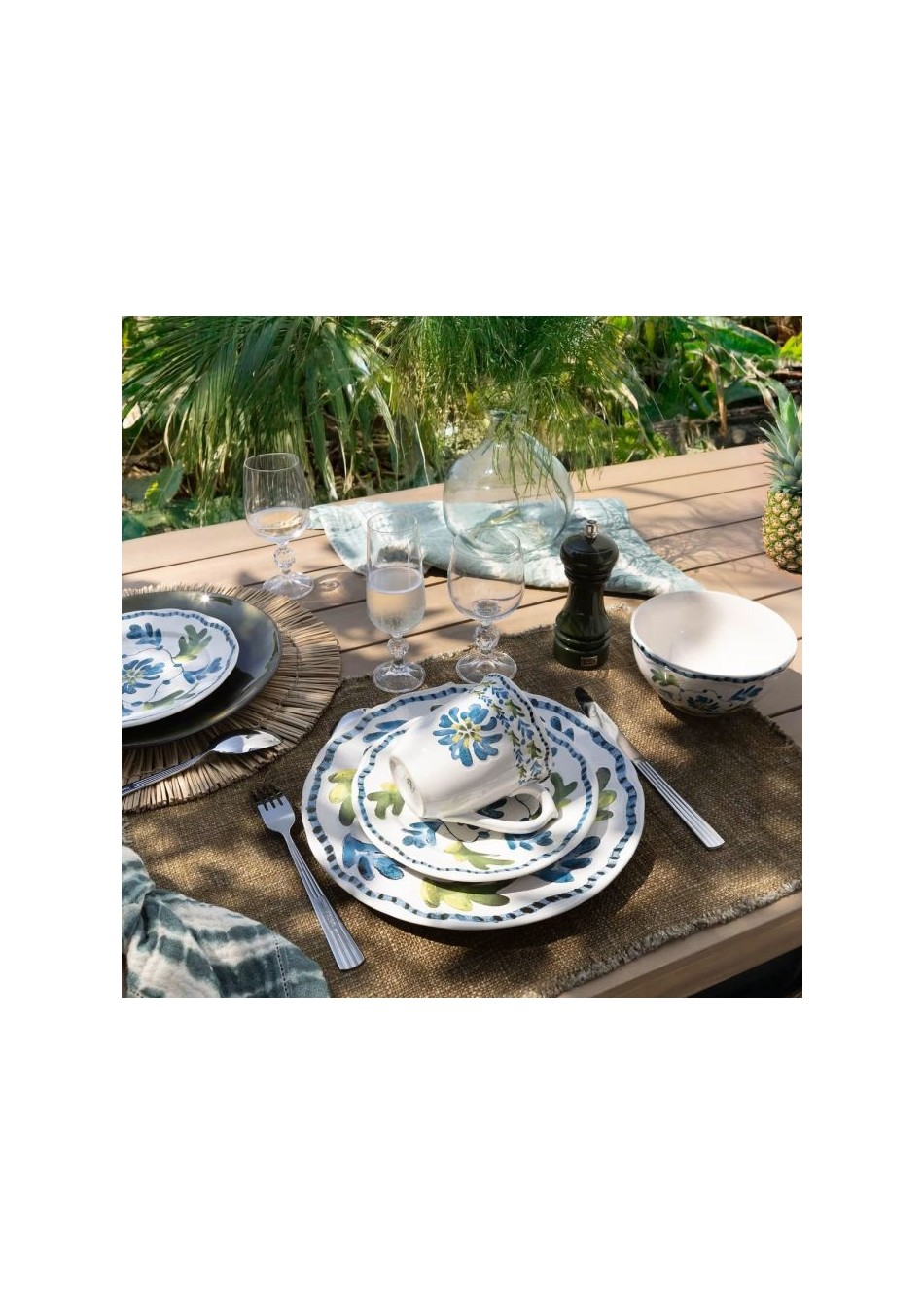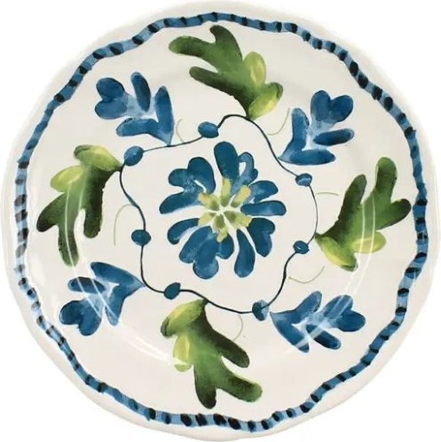 Plato Gardenia Novastyl. Plato llano de gres con diseño floral vintage en tonos verdes y azules.