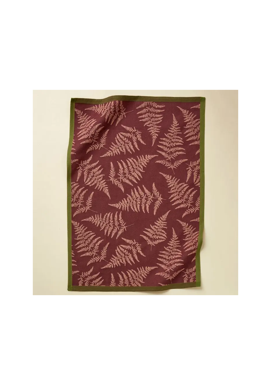 Paño Sylvie Thiriez. Paño de cocina con motivo de helecho sobre un fondo burdeos.