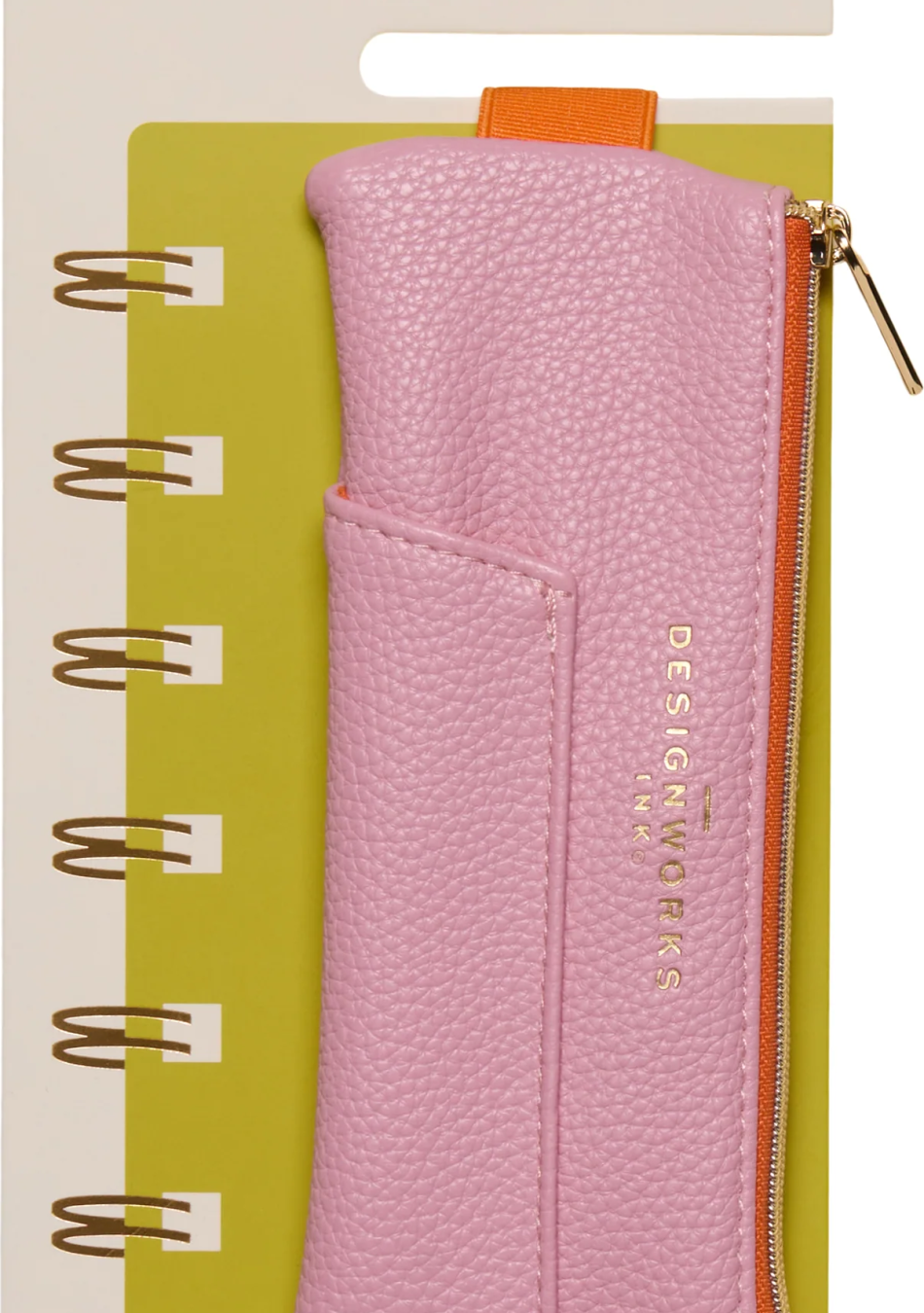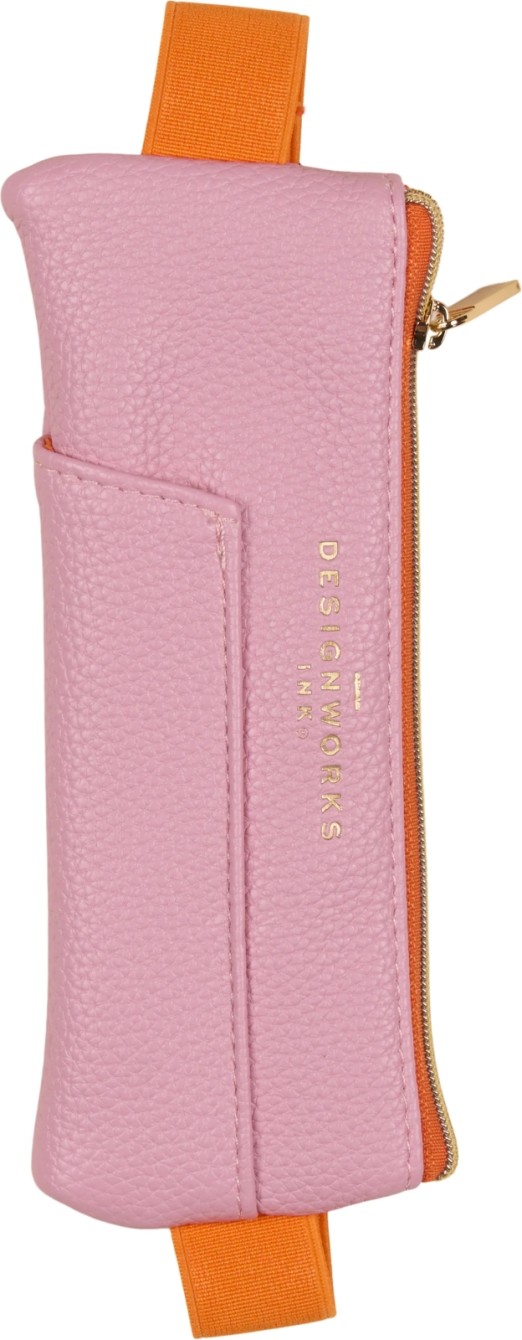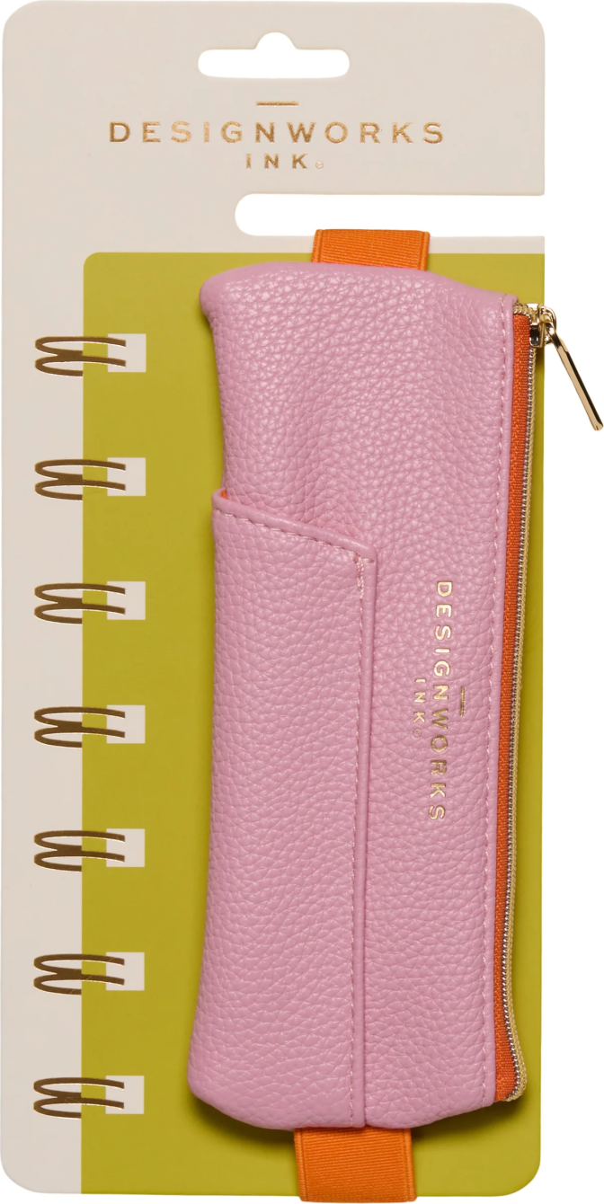 Estuche compacto de cuero vegano en color rosa con detalles en naranja, ideal para mantener tus bolígrafos y lápices organizados.