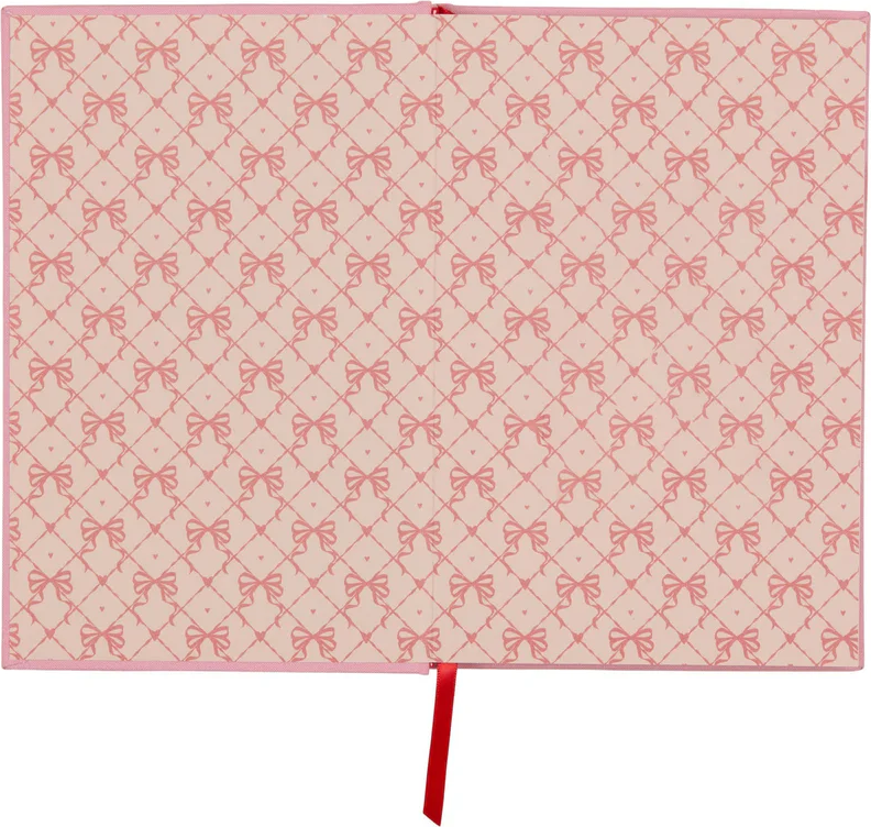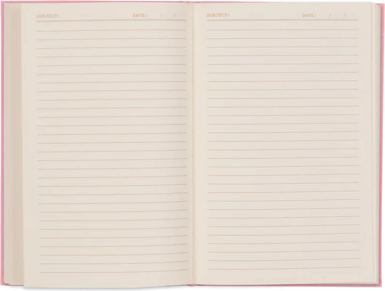 Cuaderno de 14,6 x 21,6 cm con tapa de tela estampada y 240 páginas rayadas. Cuenta con encuadernación cosida para abrirlo completamente plano, cinta marcapáginas y hojas interiores estampadas.