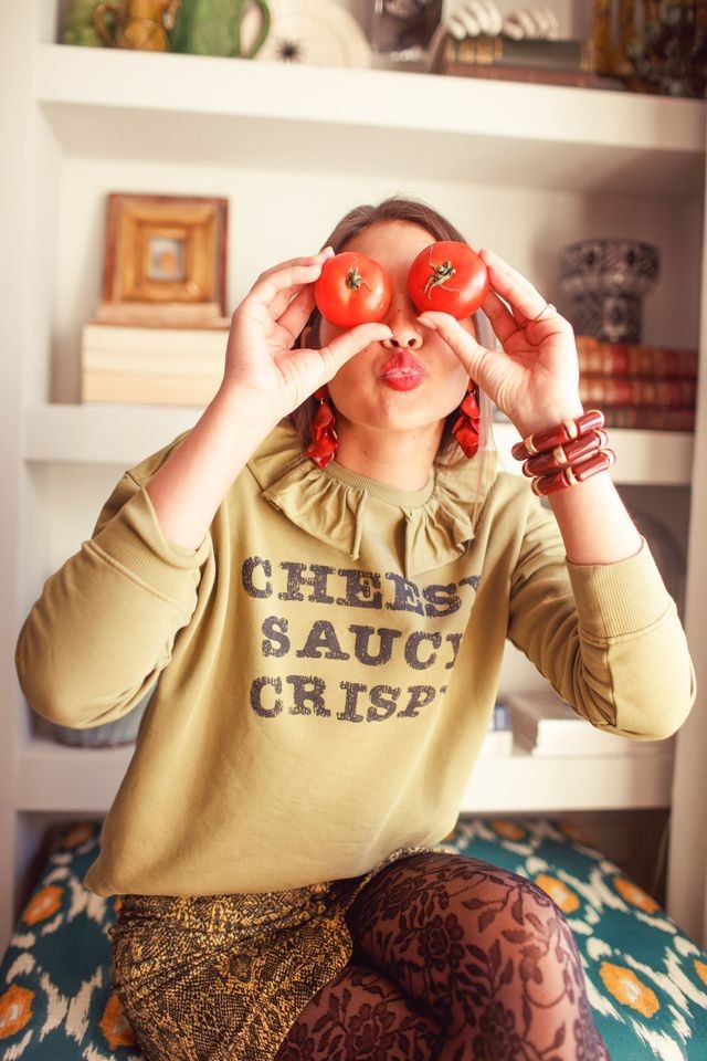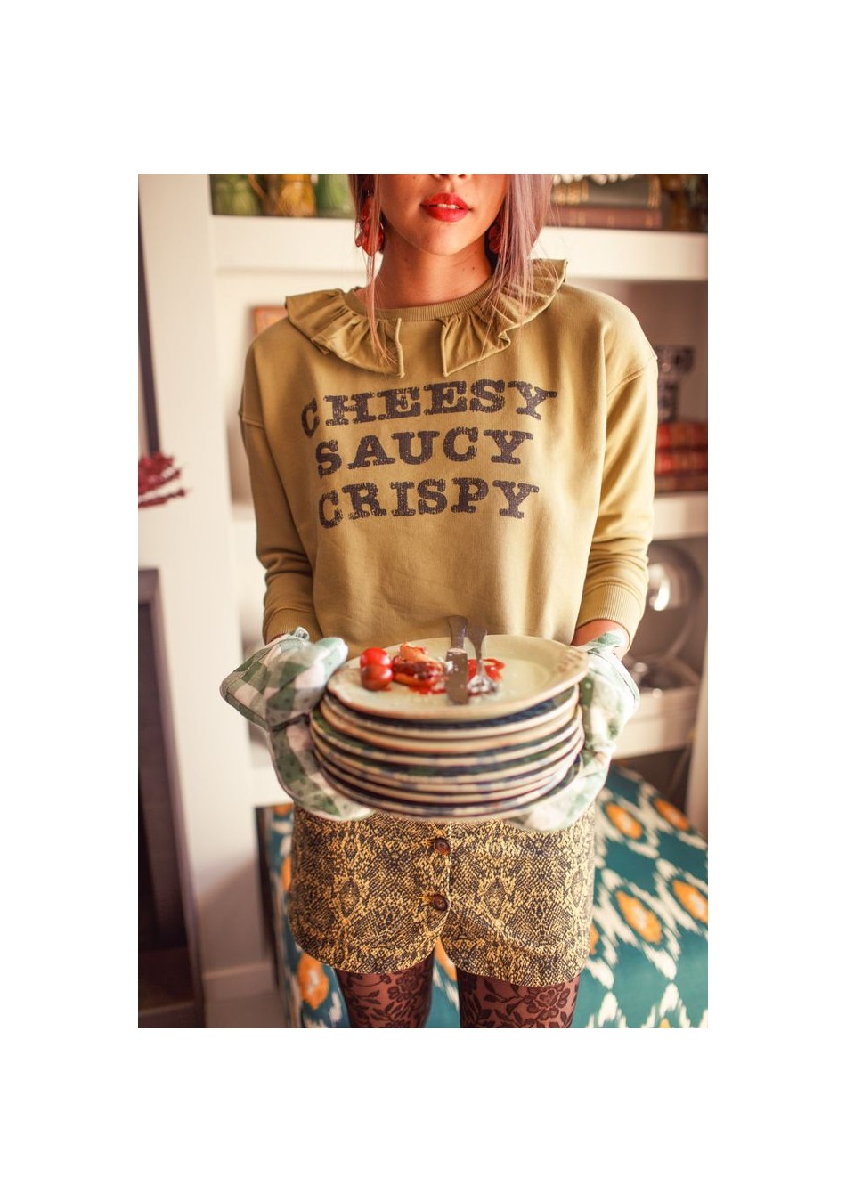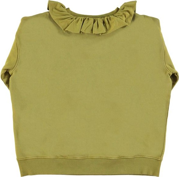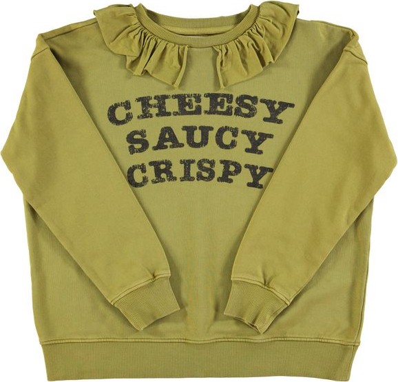 Sudadera Cheesy Sisters Depatment. Sudadera de manga larga, de corte recto y cuello con volante, en color verde oliva y con serigrafía en el delantero.
