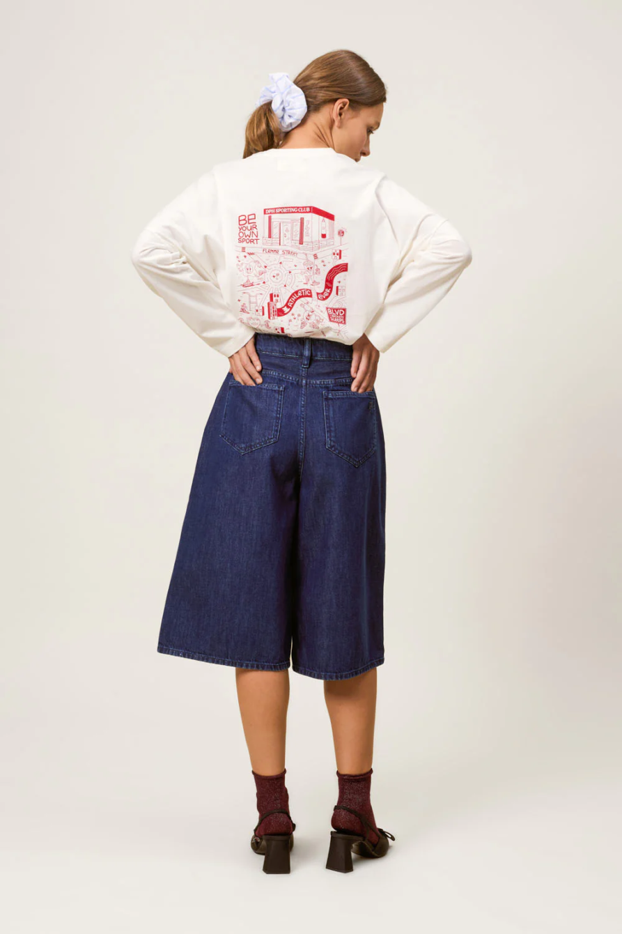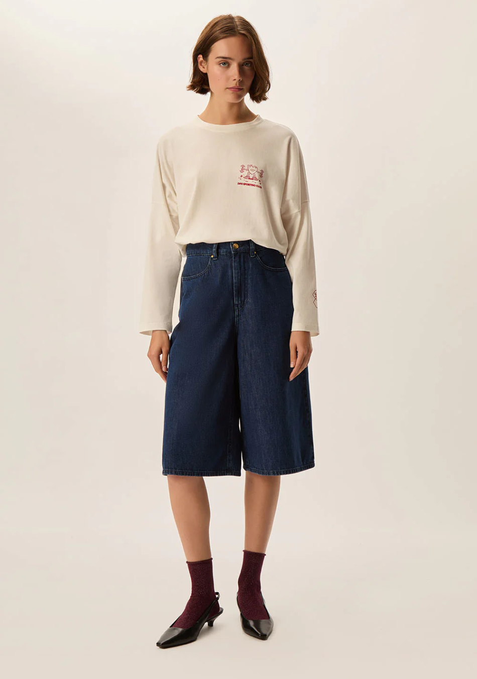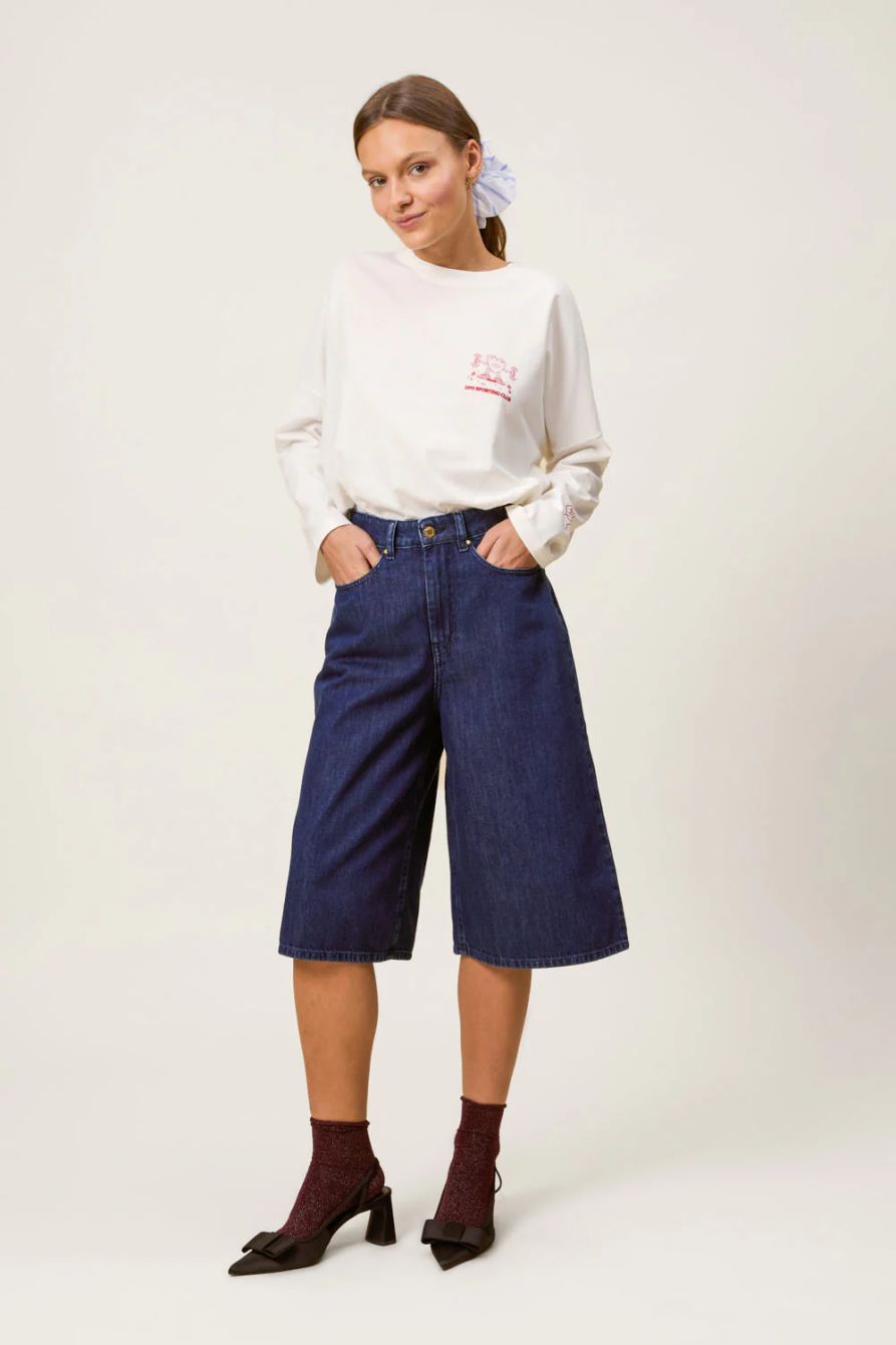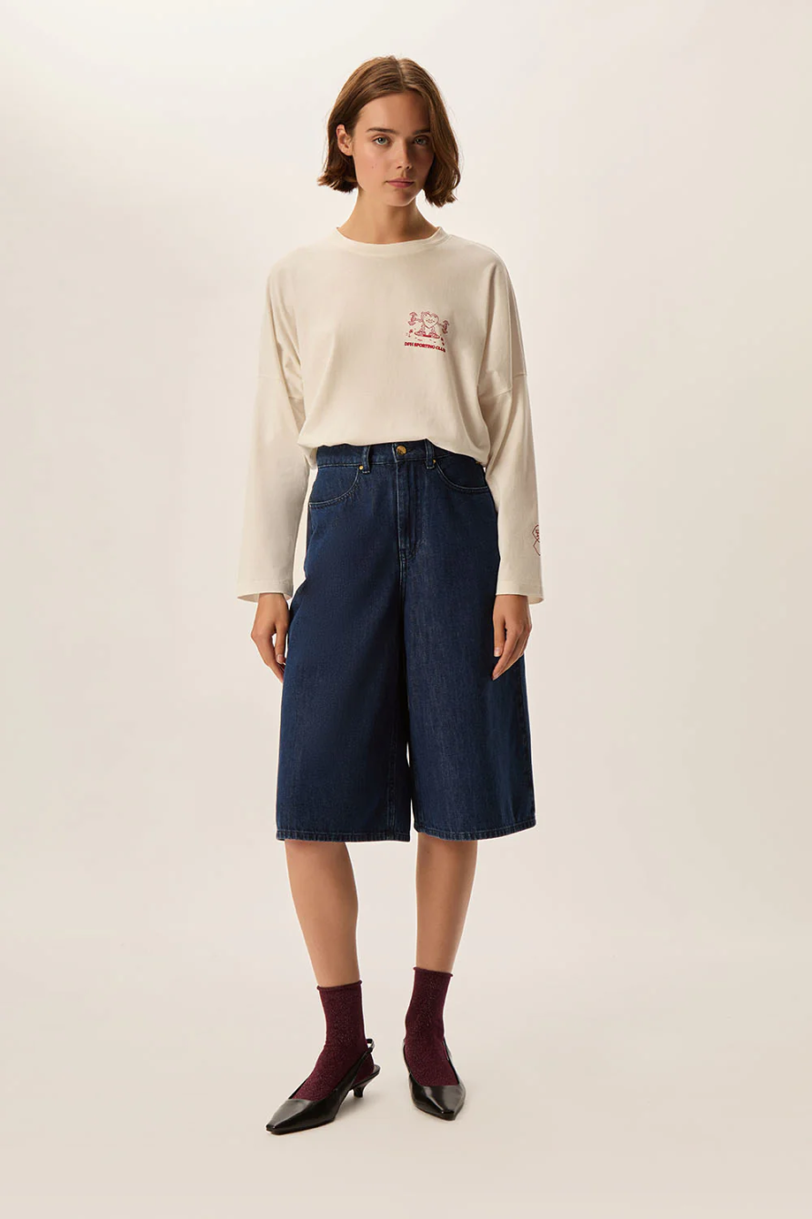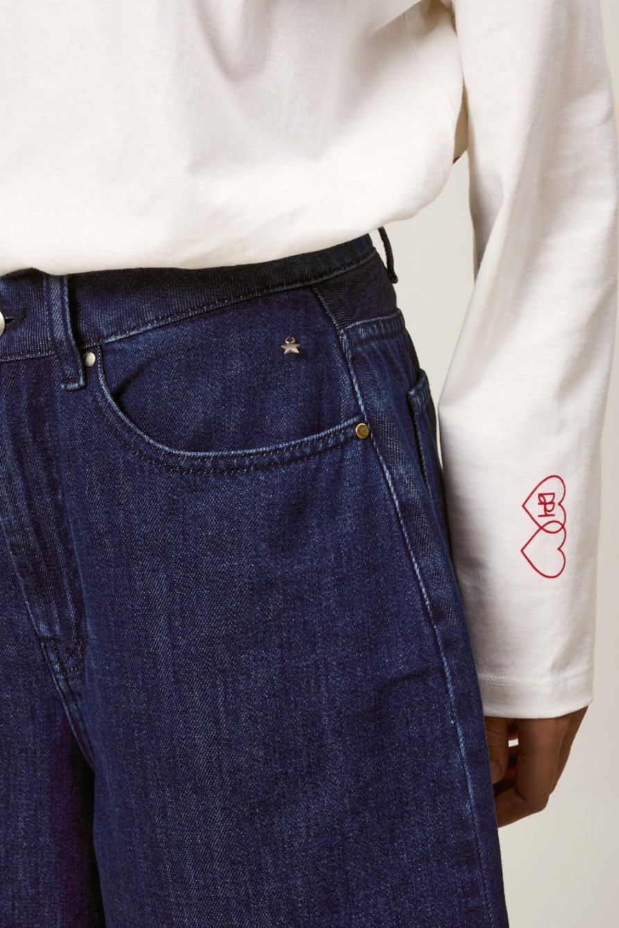 Vaquero Davis Sessùn. Pantalón vaquero de corte recto y talle medio-alto, con pernera ligeramente acampanada y largo tobillero. Puntadas a contraste, color azul denim oscuro.