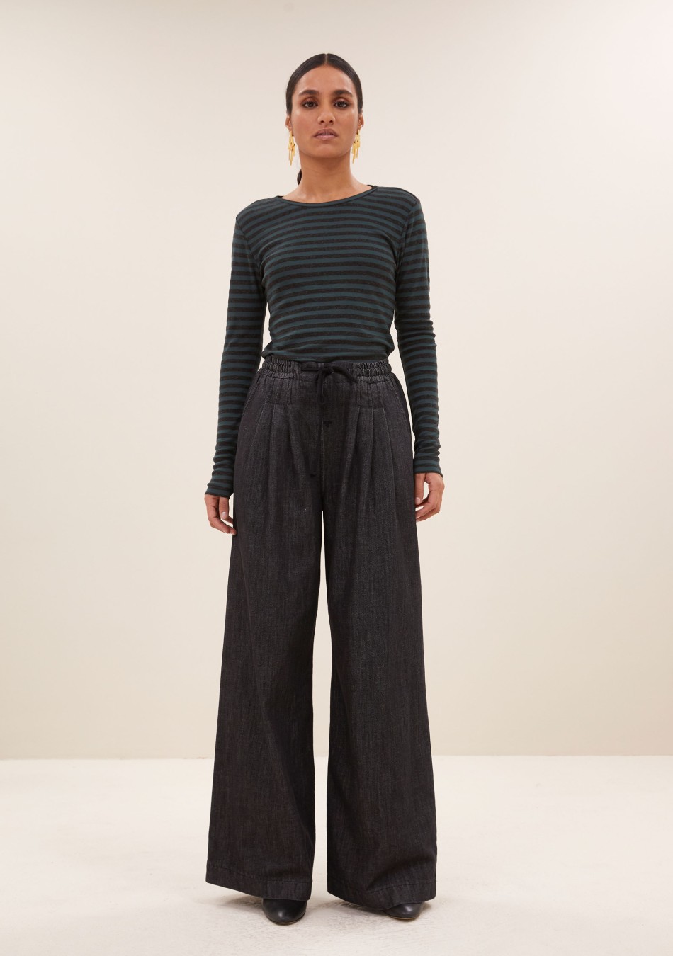 Falda larga de rayas confecciona en un viscosa con mucha caída. Detalle de canesú a la cintura curvado que estiliza la figura.
