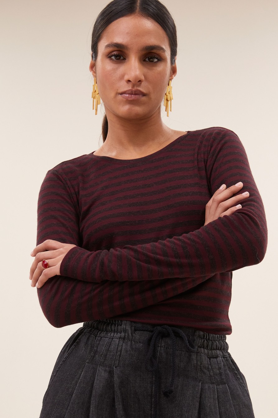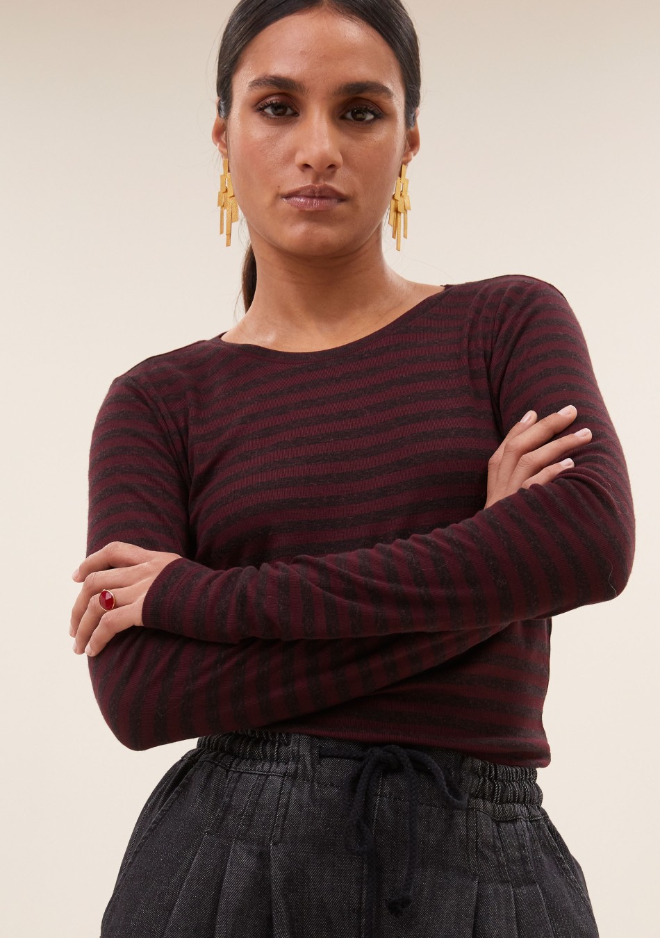 Falda larga de rayas confecciona en un viscosa con mucha caída. Detalle de canesú a la cintura curvado que estiliza la figura.