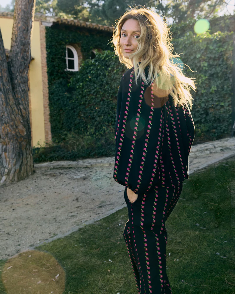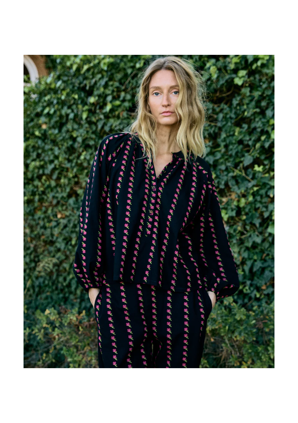 Blusa a rayas finas con un corte recto y corto. Cuello camisero y puños anchos.