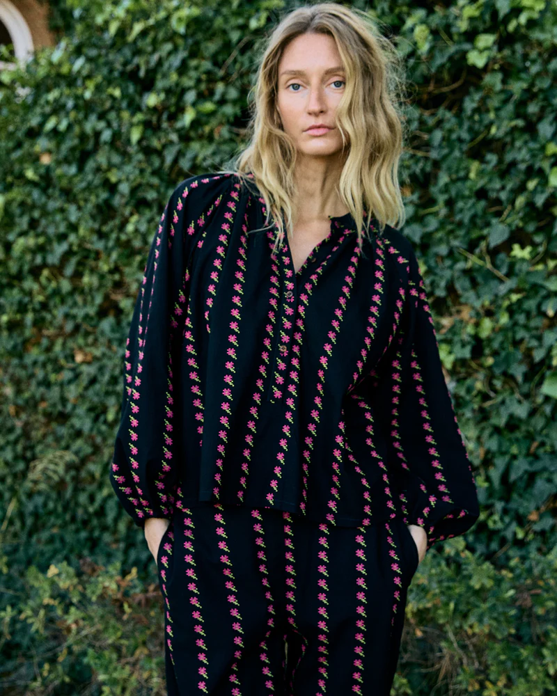 Blusa confeccionada en algodón de popelin con un corte clásico recto y detalle de pañoleta al cuello.