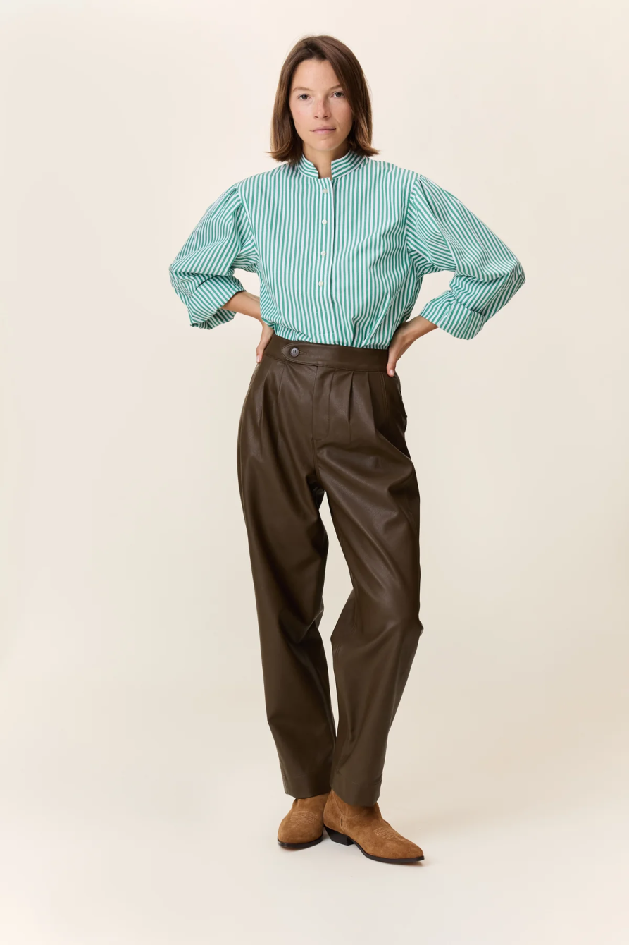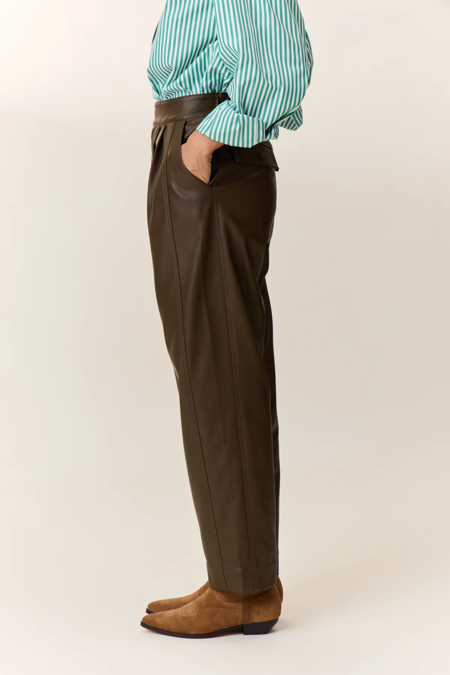 Pantalón Penelope Brown Leon&Harper. Pantalón de pinzas de cintura alta, con cinturilla ancha abrochada con botón y corte tobillero. De piel en color marrón