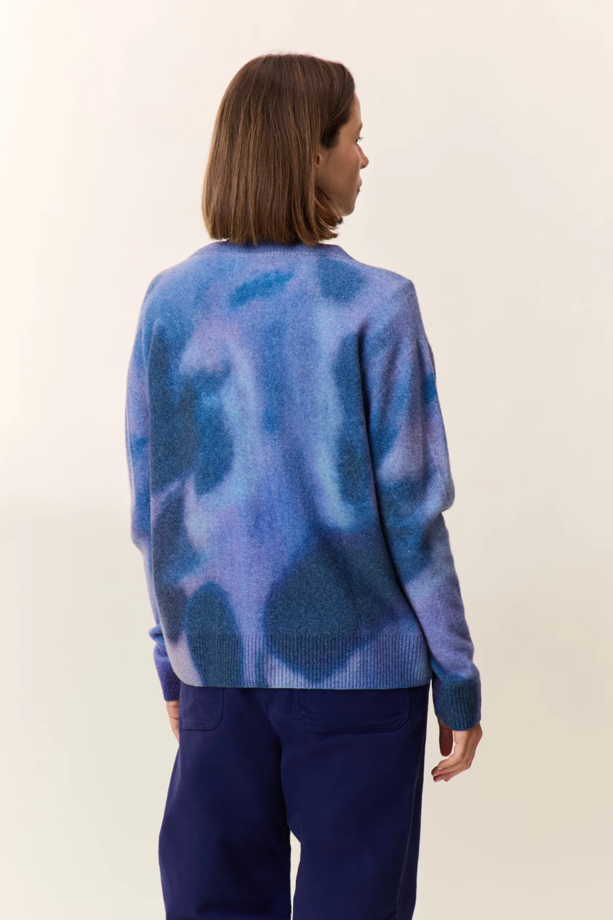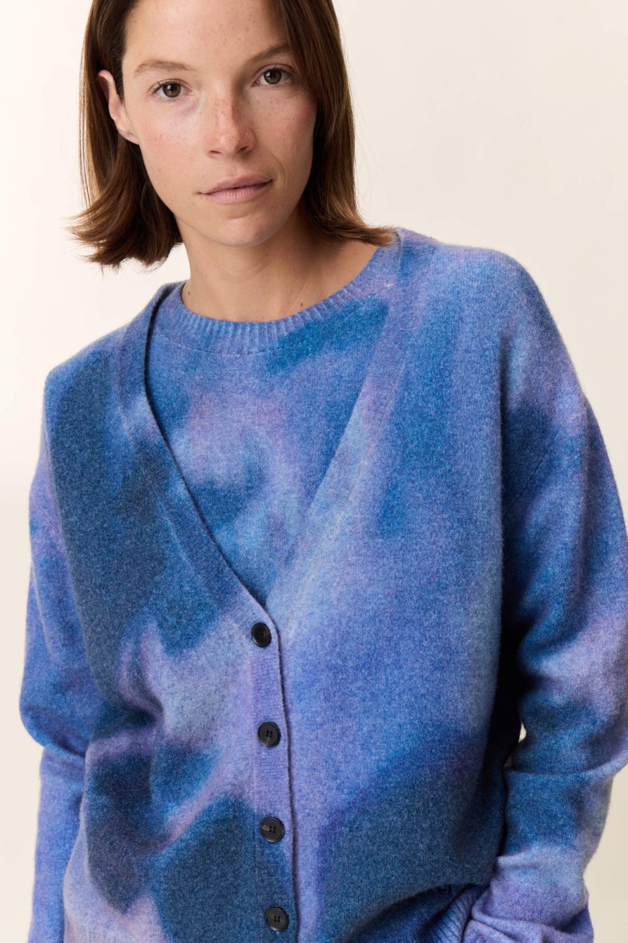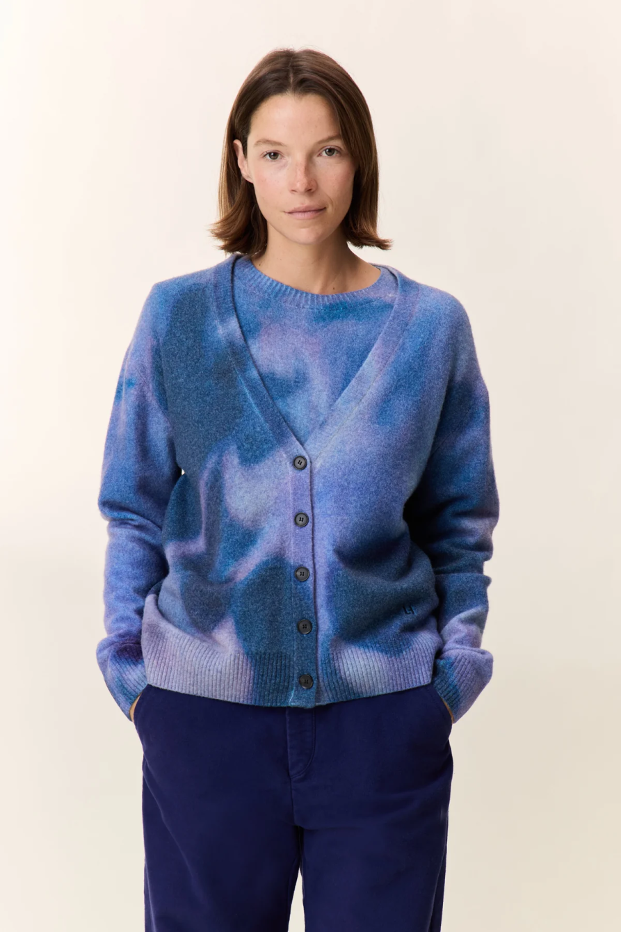 Cárdigan Ming Leon&Harper. Cárdigan de corte recto con escote en pico y estampado abstracto en tonos azules y malva.