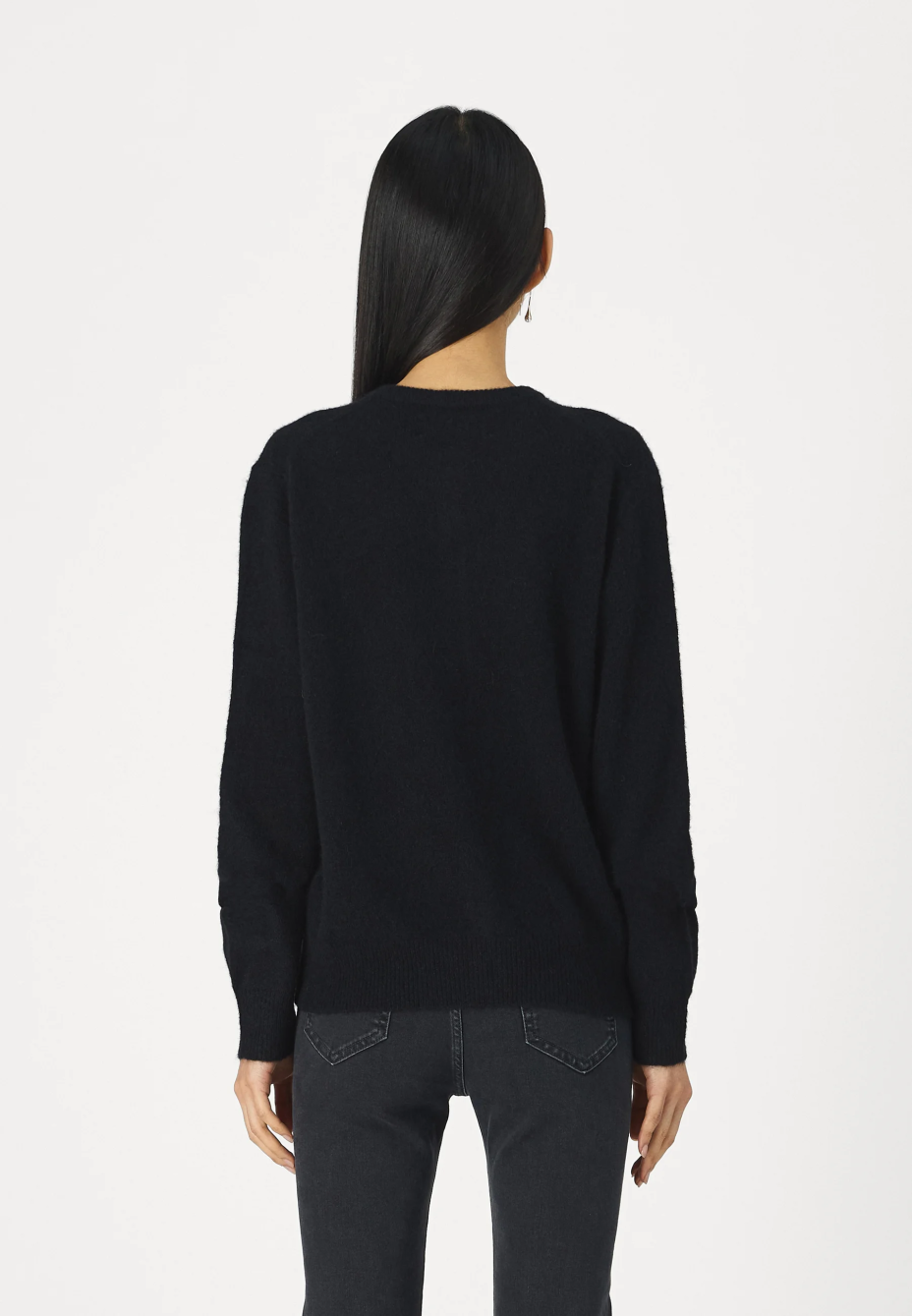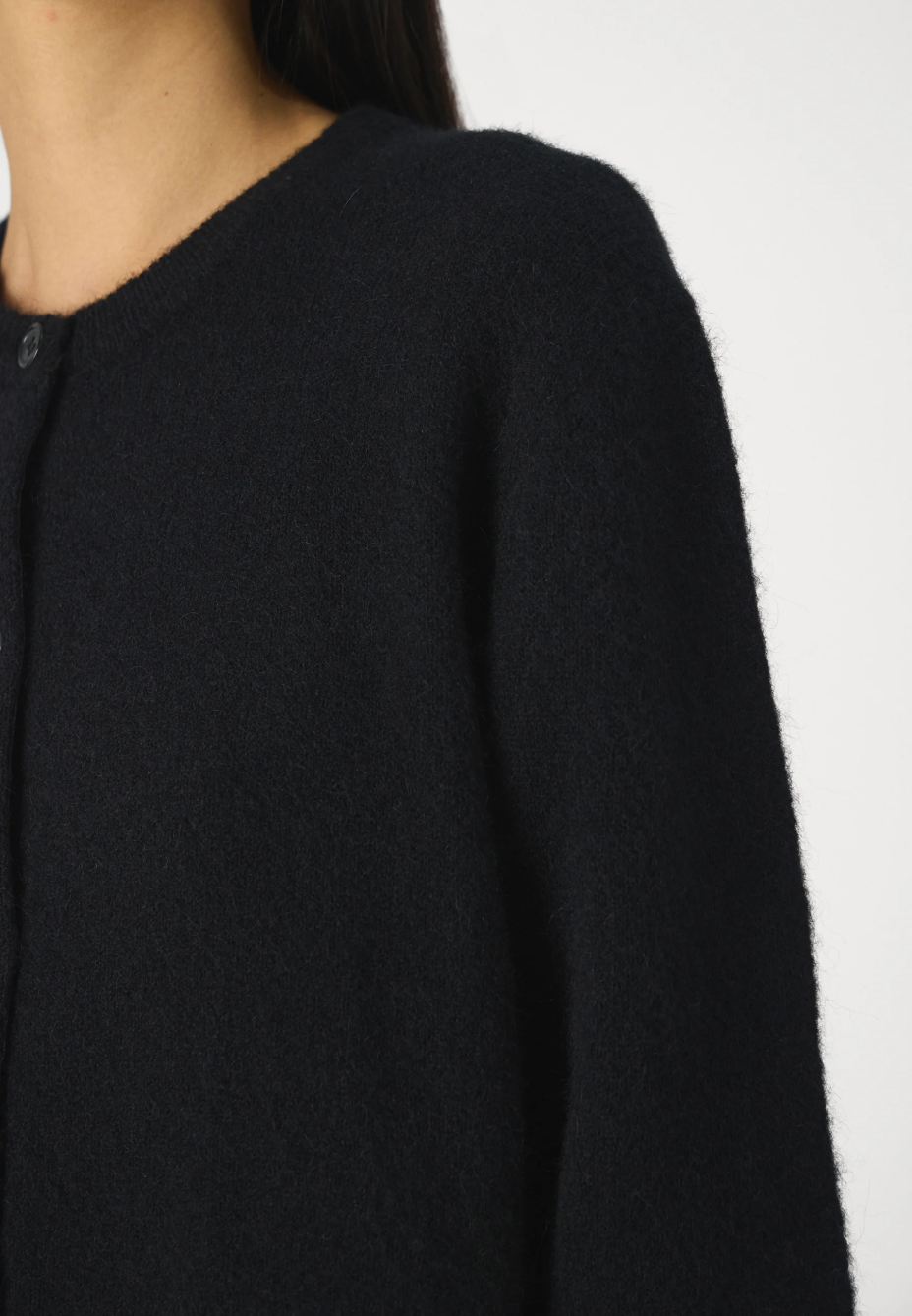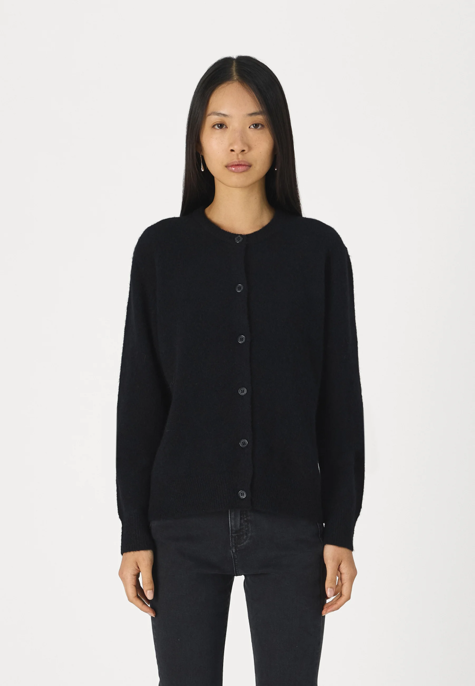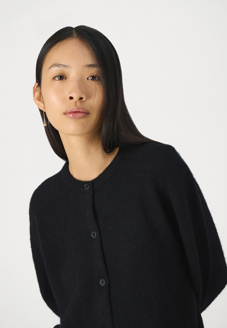 Cárdigan corto de lana merino y manga larga con cierre con botones al frente y costuras en los hombros.