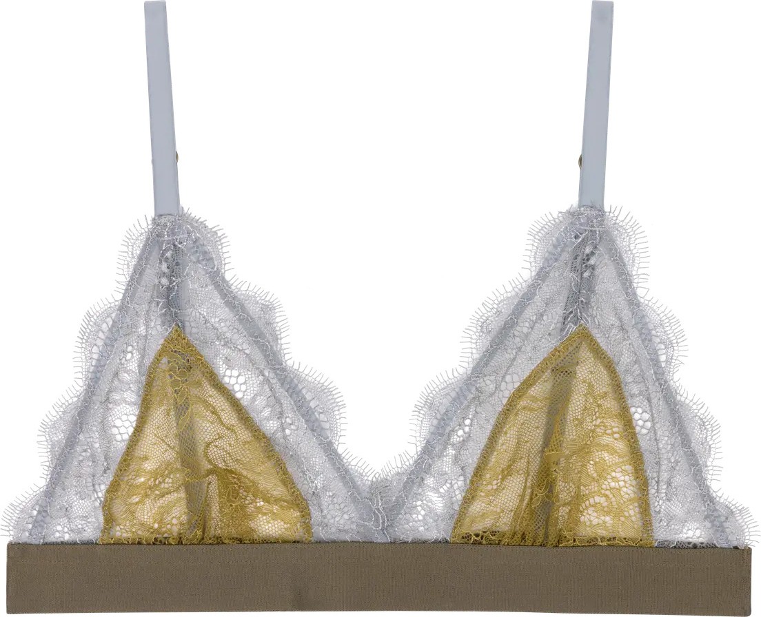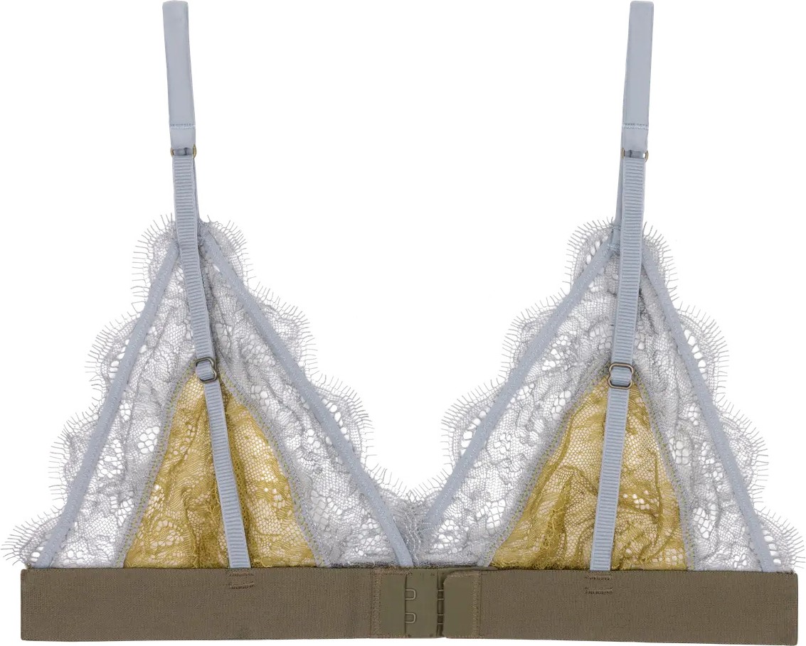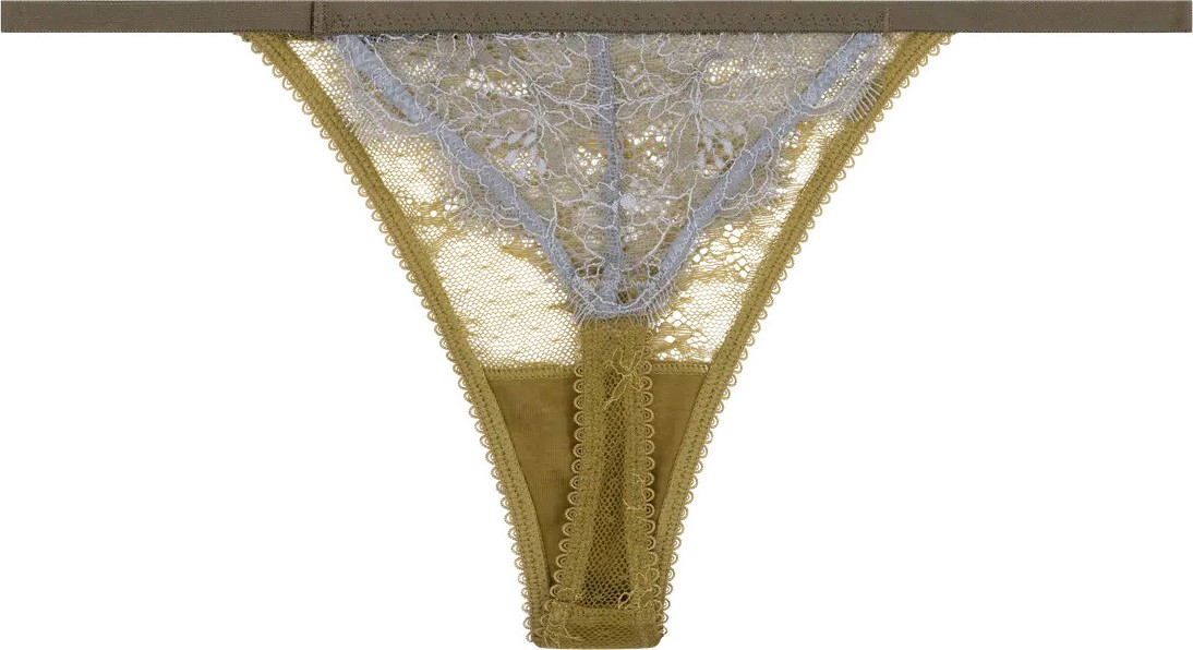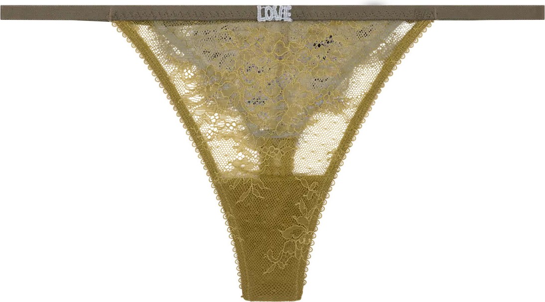 Conjunto Lencería Love Stories. Conjunto de lencería de encaje en color marrón. Sujetador tipo bralette con escote en "v" sin relleno y braguita tipo tanga de encaje.