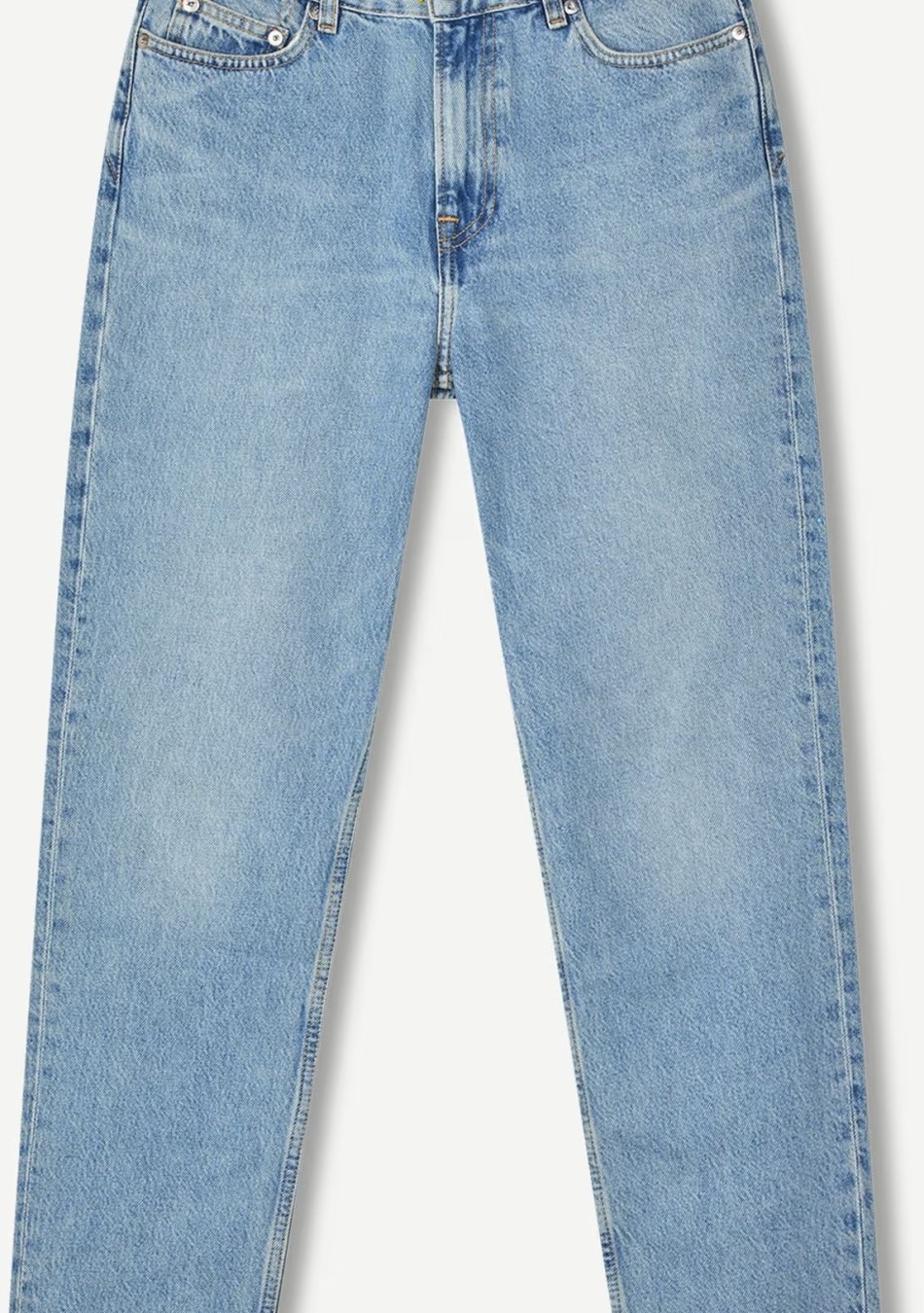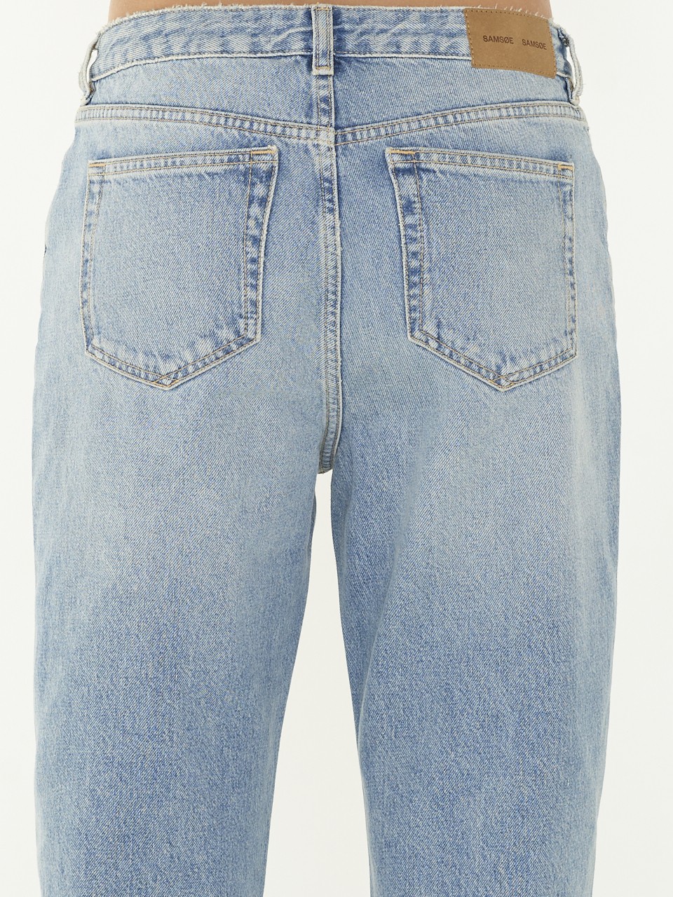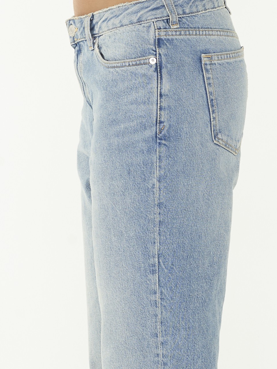 Denim en 3D con una textura única, de corte recto y tiro medio. Al tacto es suave y con una acabado fluido