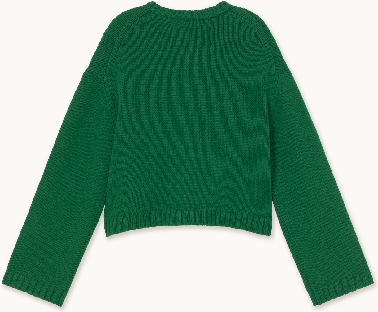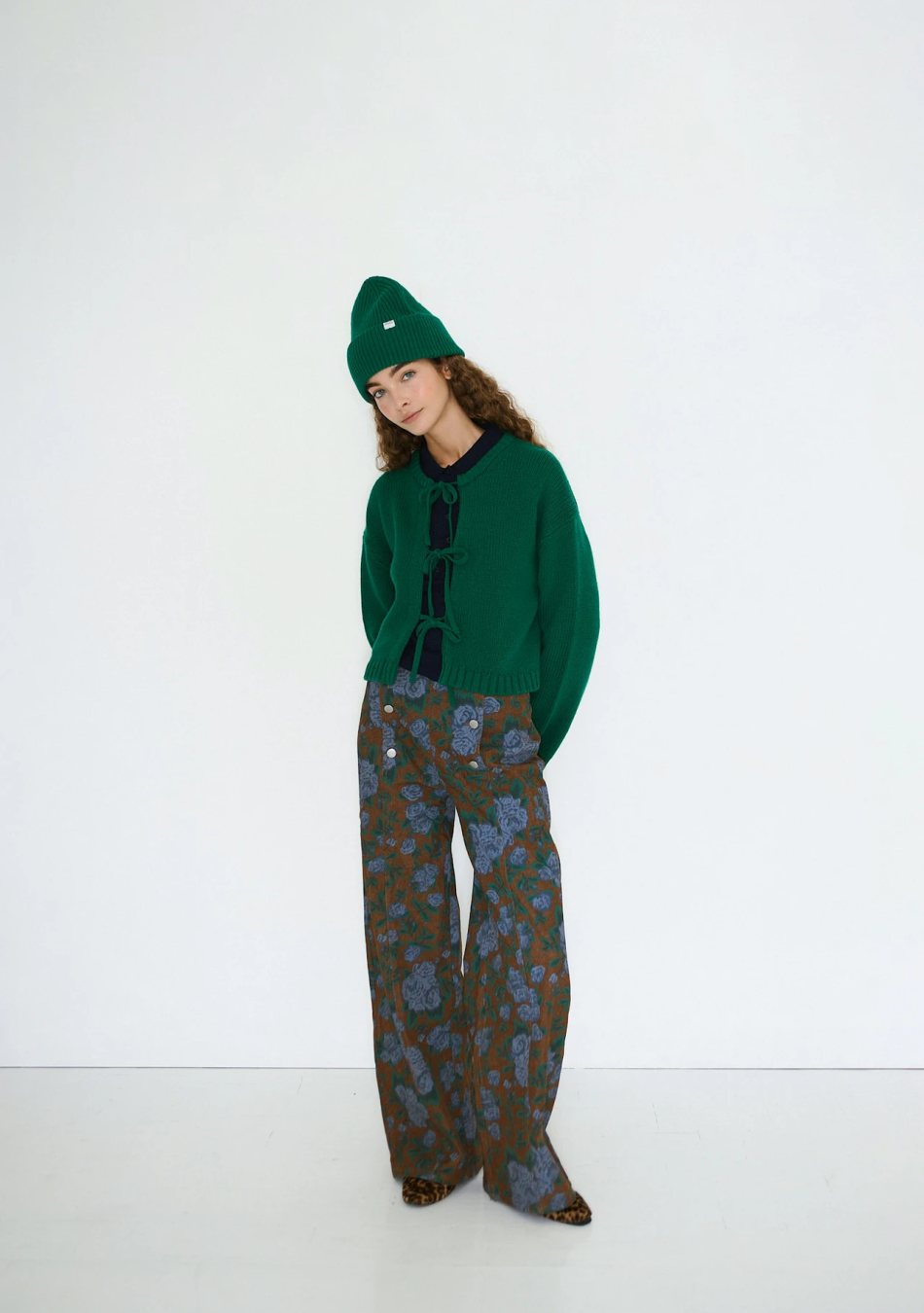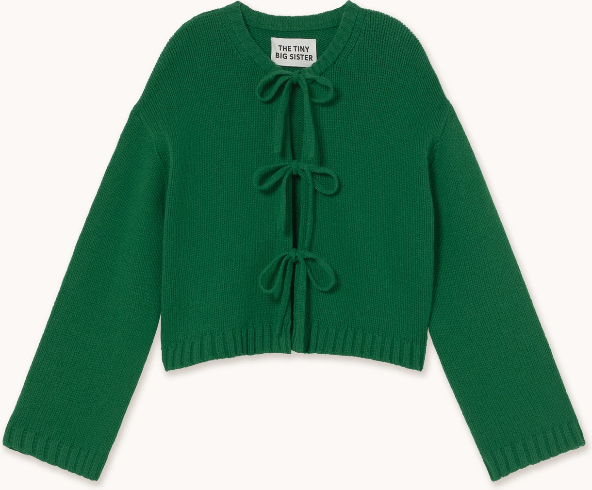 Cárdigan de lana merino con forma recta cuadrada, cuello redondo con terminación acanalada y cierre central con cordones.