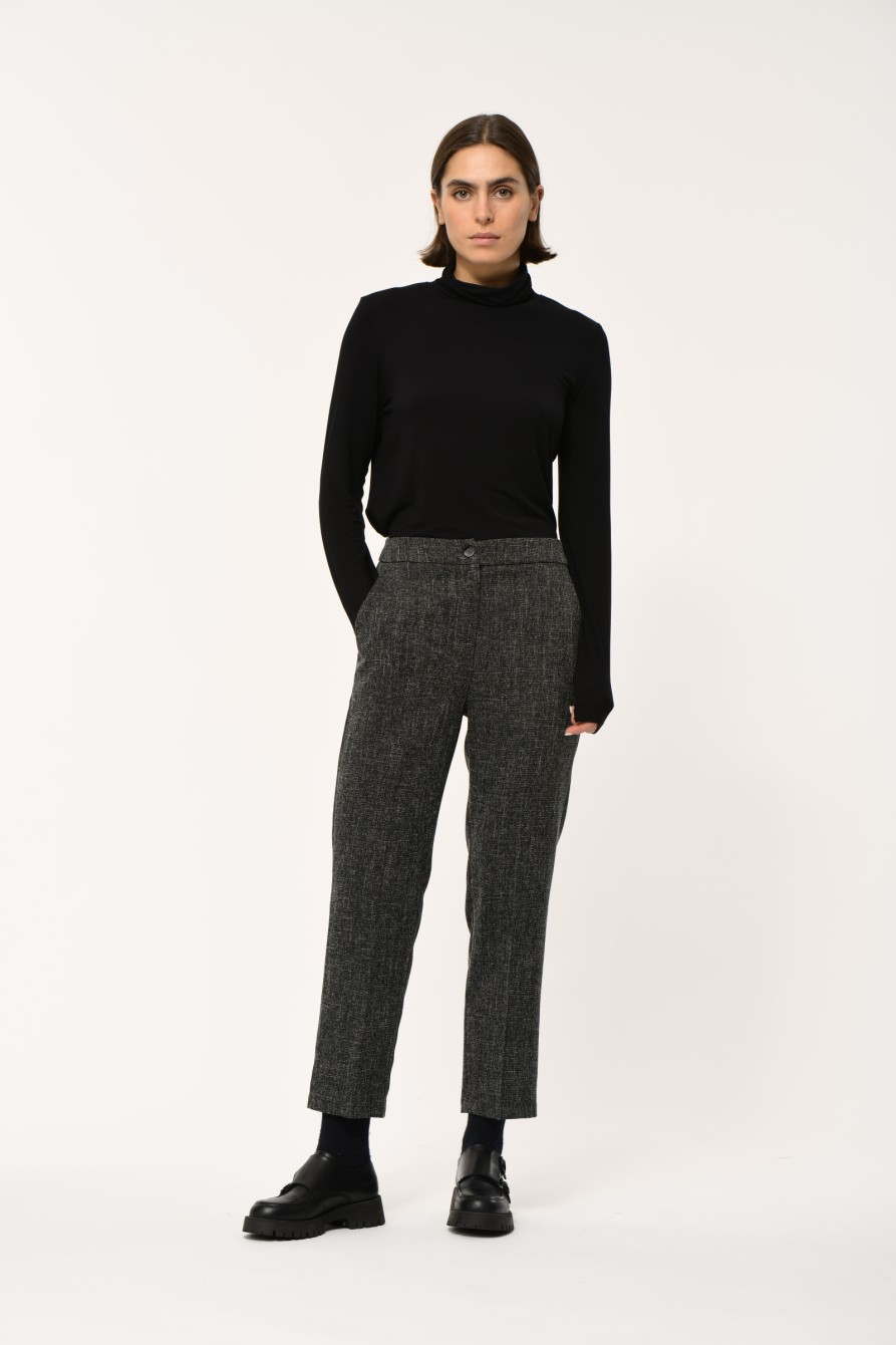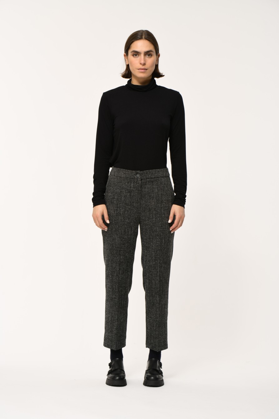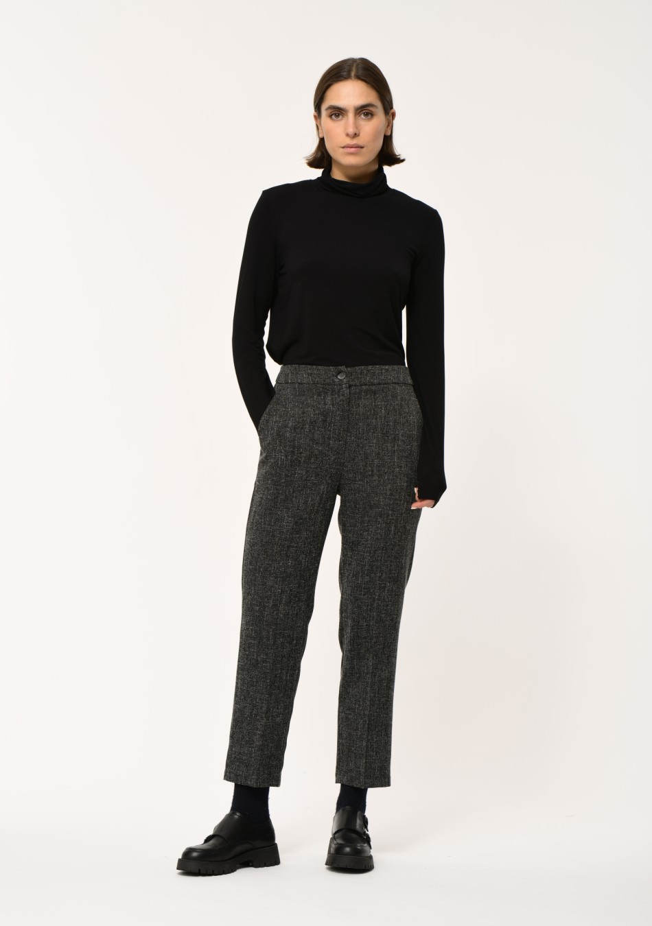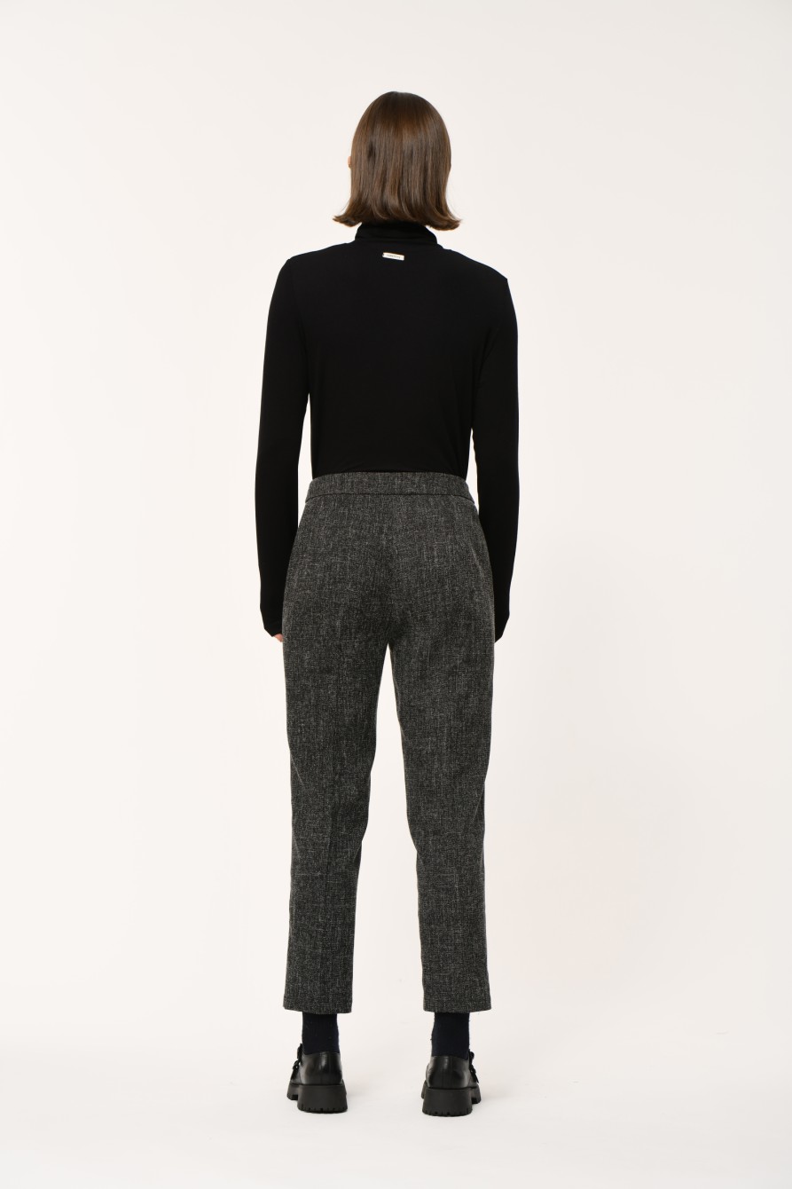Pantalón de tweed jaspeado de corte pitillo y cintura alta. Combínalo con el chaleco a juego.