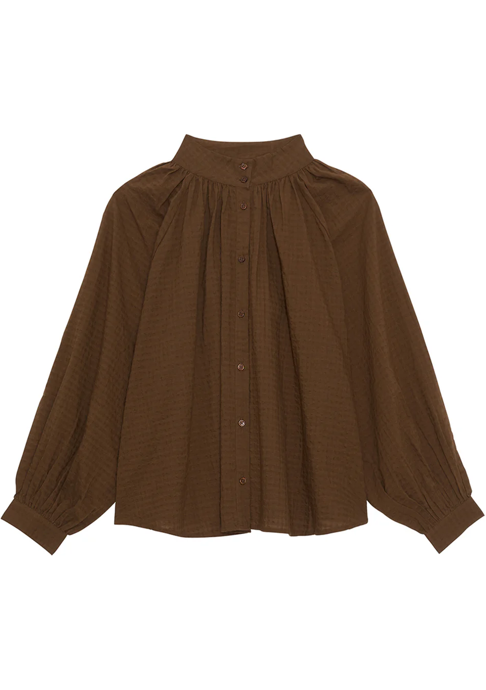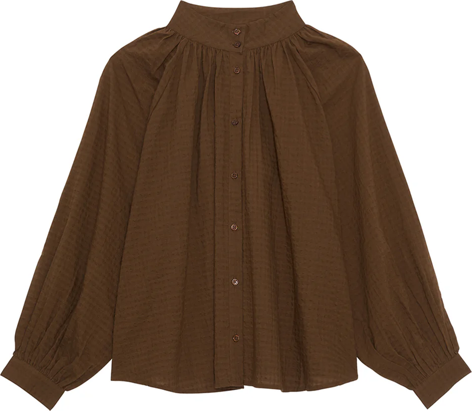 Blusa Milton Bellepiece. Blusa de popelin en color azul, de corte amplio, cuello alto y abotonado y frunces en espalda y mangas.