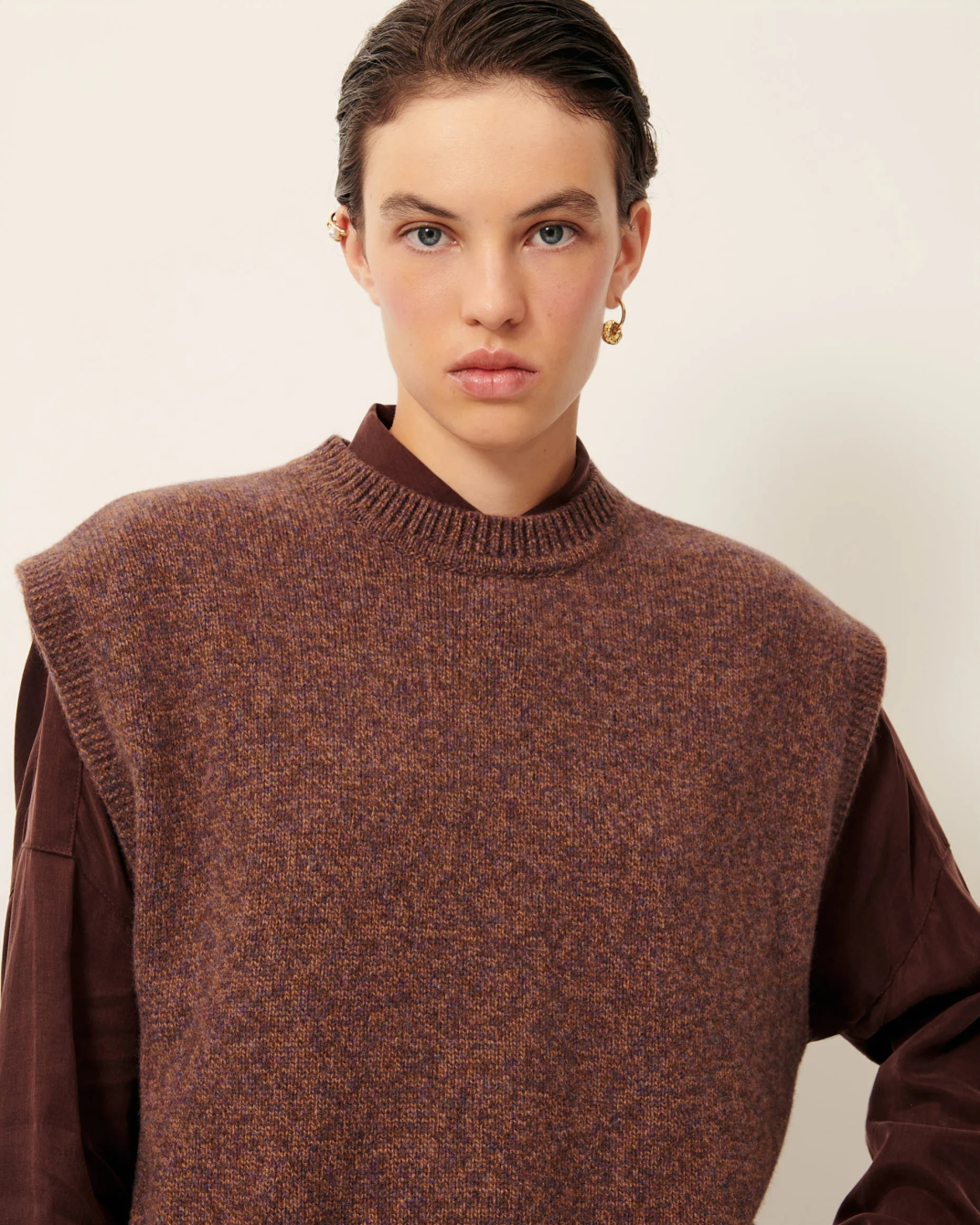 Chaleco de punto jaspeado de corte holgado y cuello redondo con detalle de acabado acanalado de fantasia en la cintura.