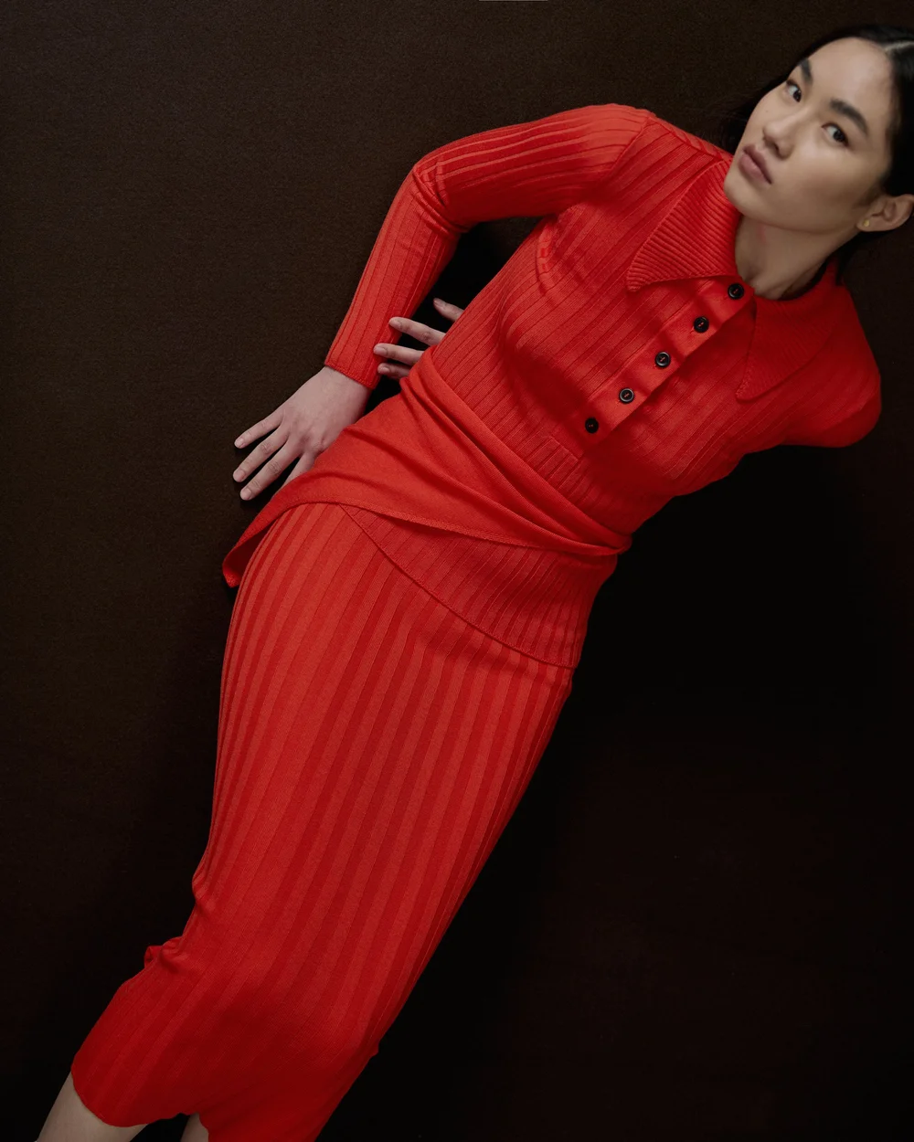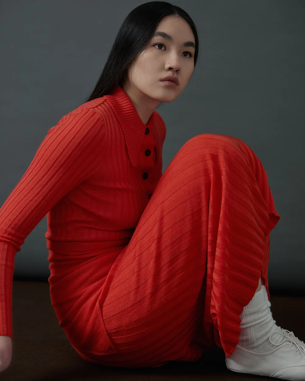 Top Jodi Sessùn. Jersey tipo polo con manga 3/4 en punto acanalado y calado. Acabados en contraste, en color lila y marrón chocolate