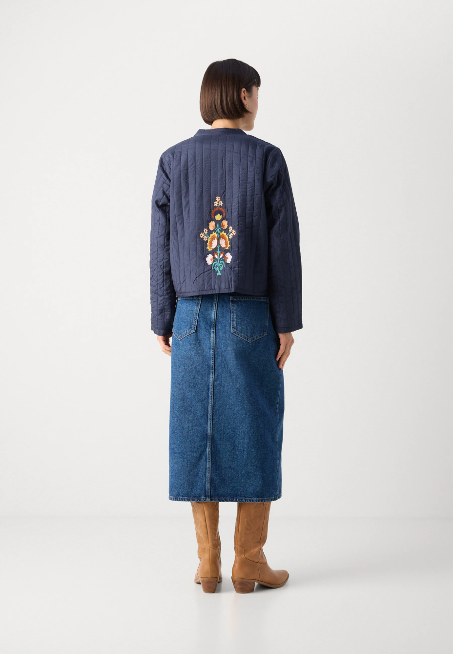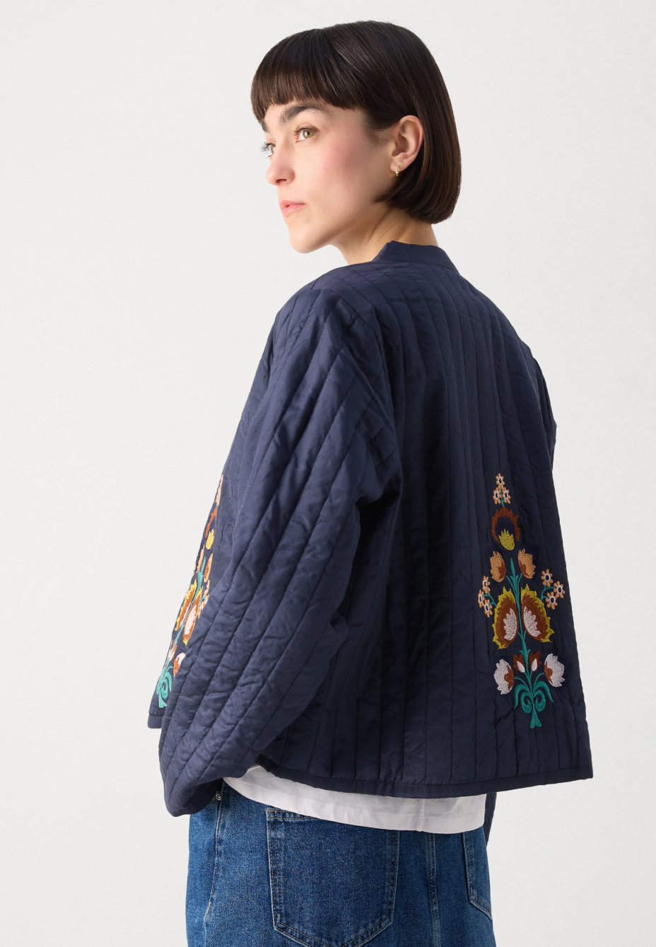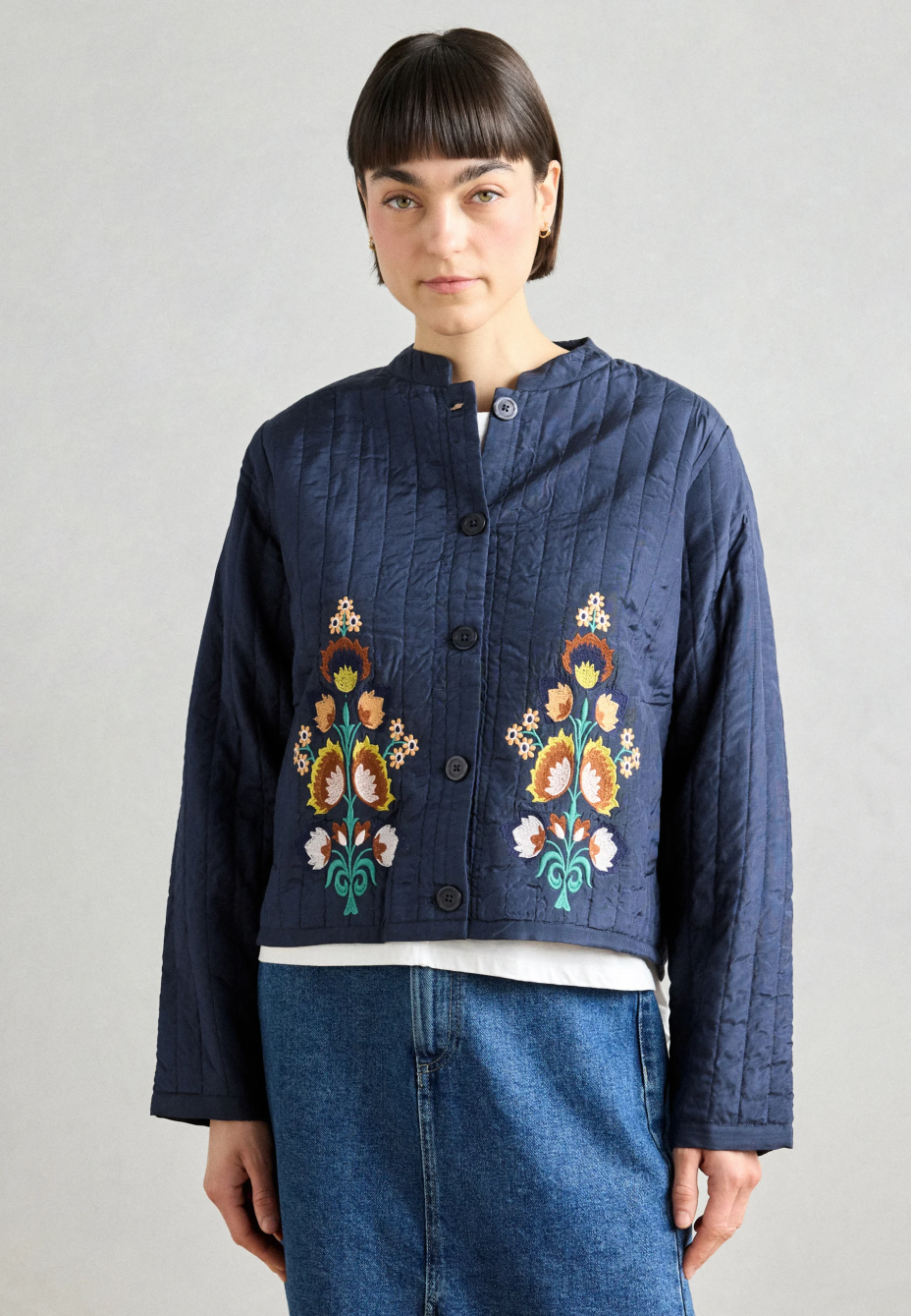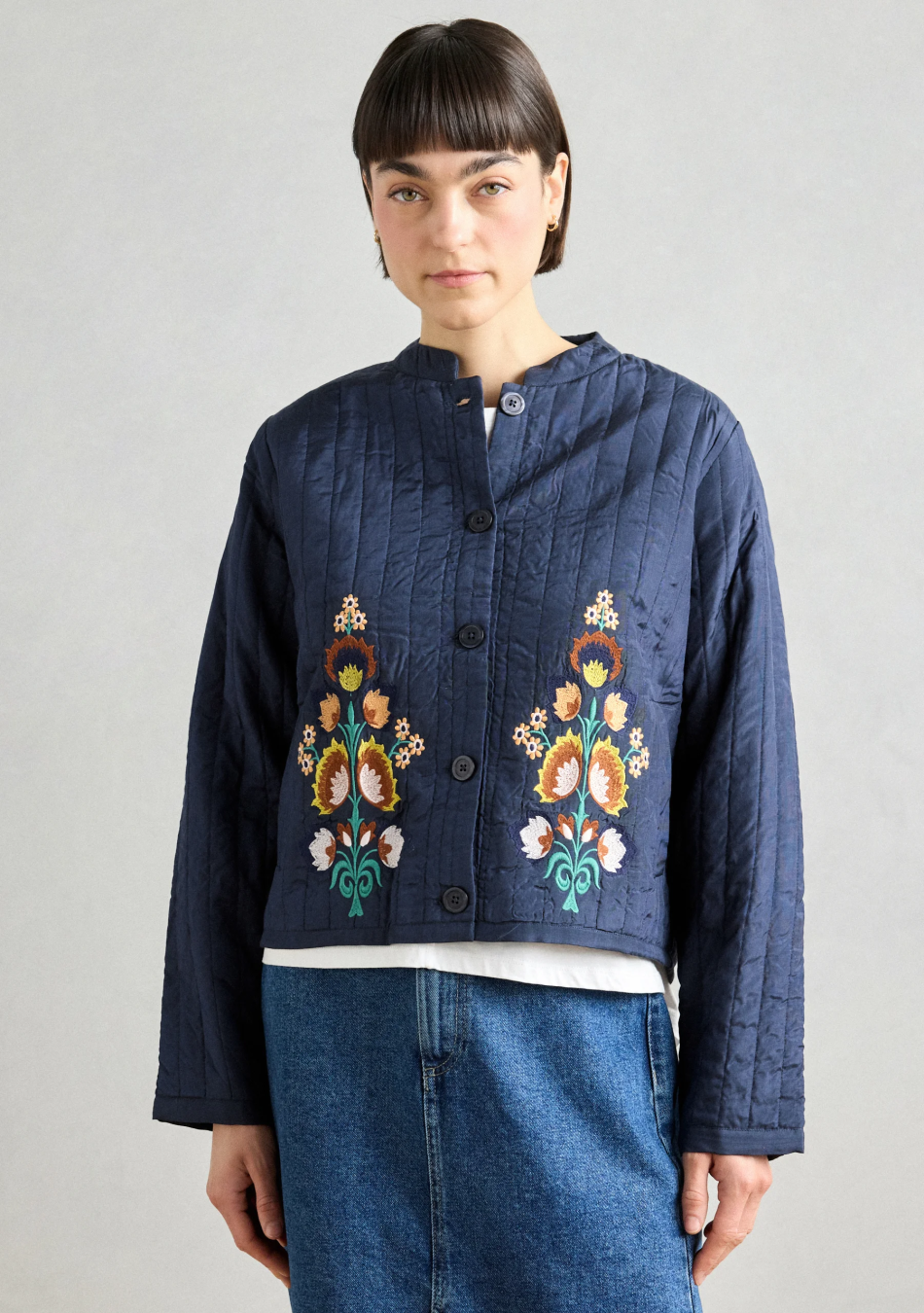 Chaqueta de corte recto y cuello mao, abotonada en el delantero y confeccionada con un tejido estampado de flores.