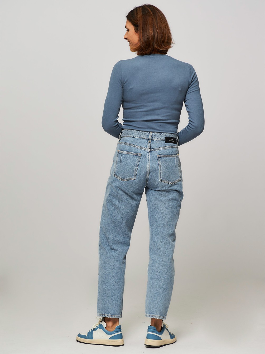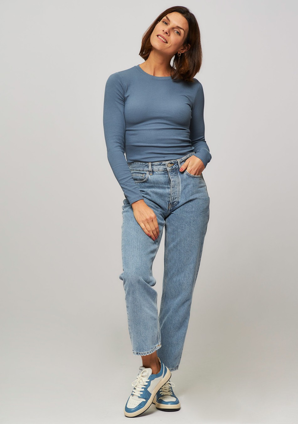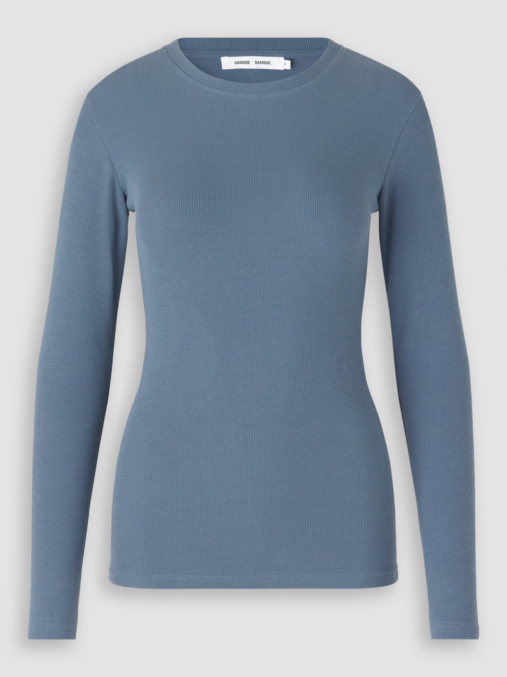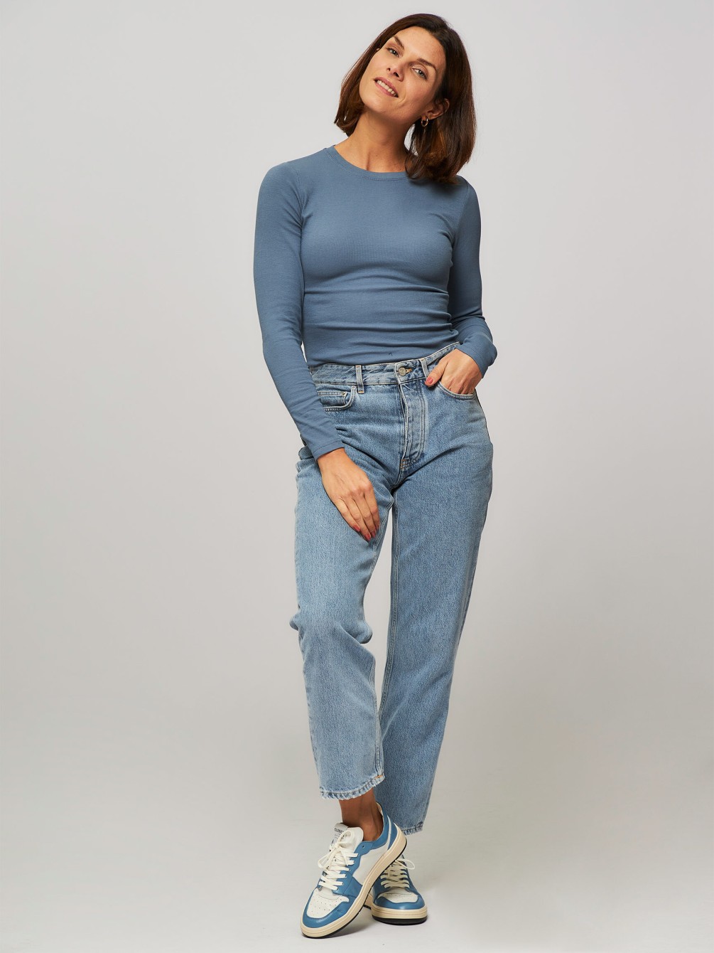 Camiseta de manga larga ajustada al cuerpo, con cuello redondo y en color azul claro.