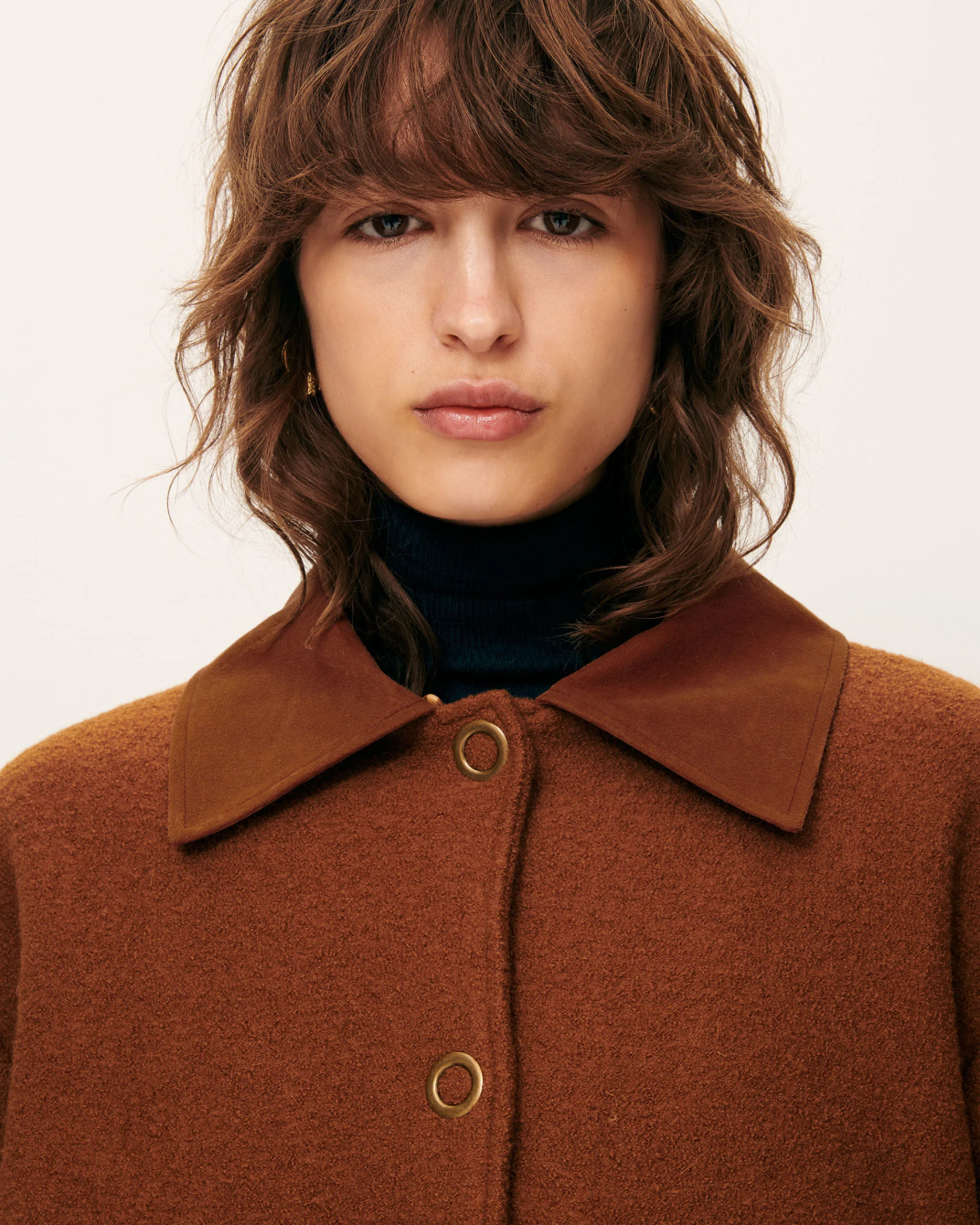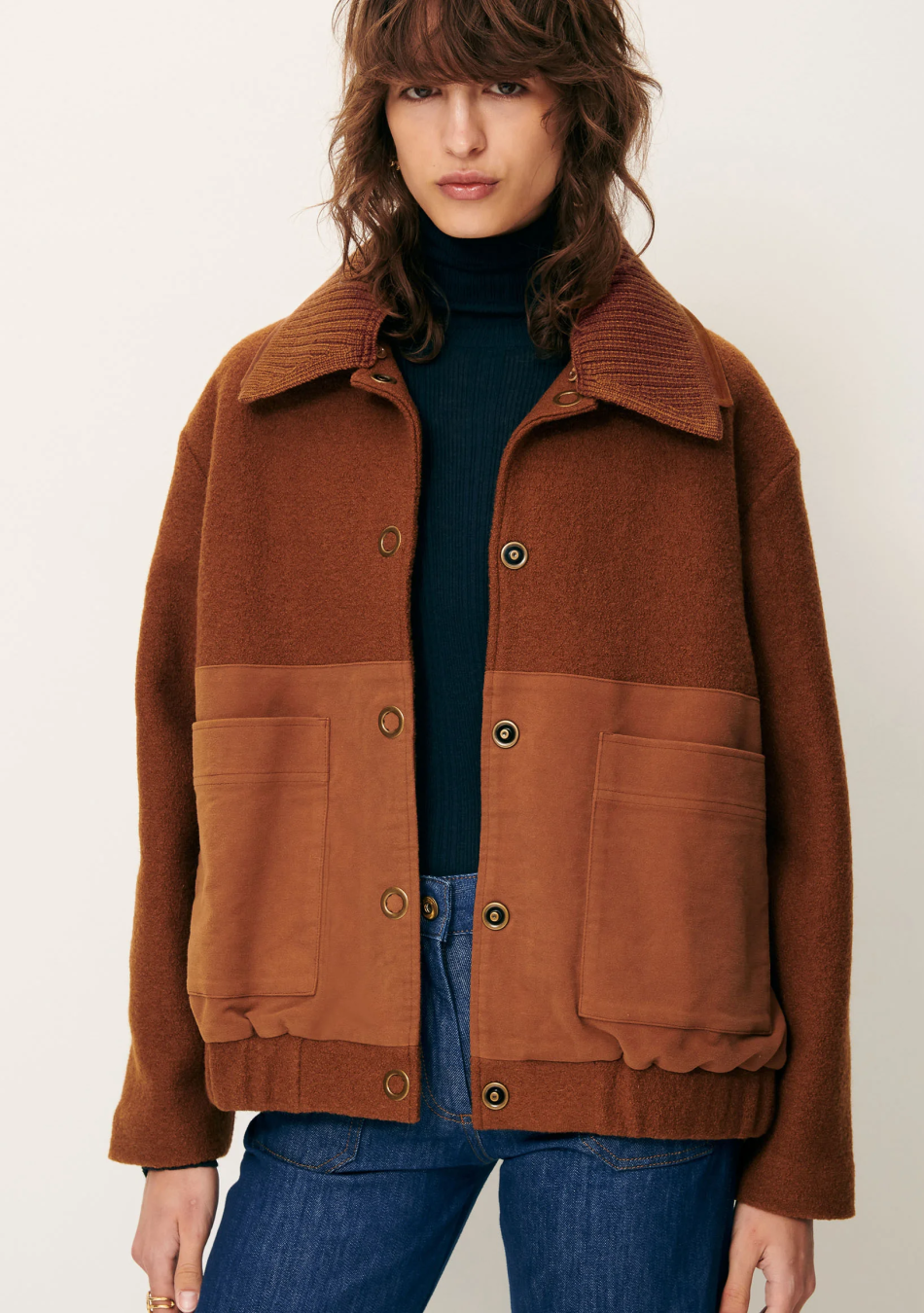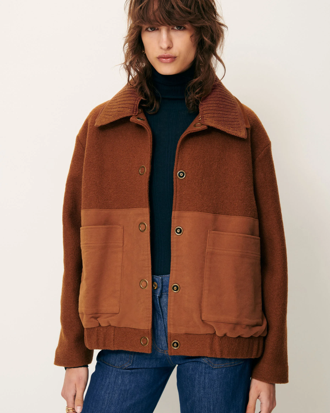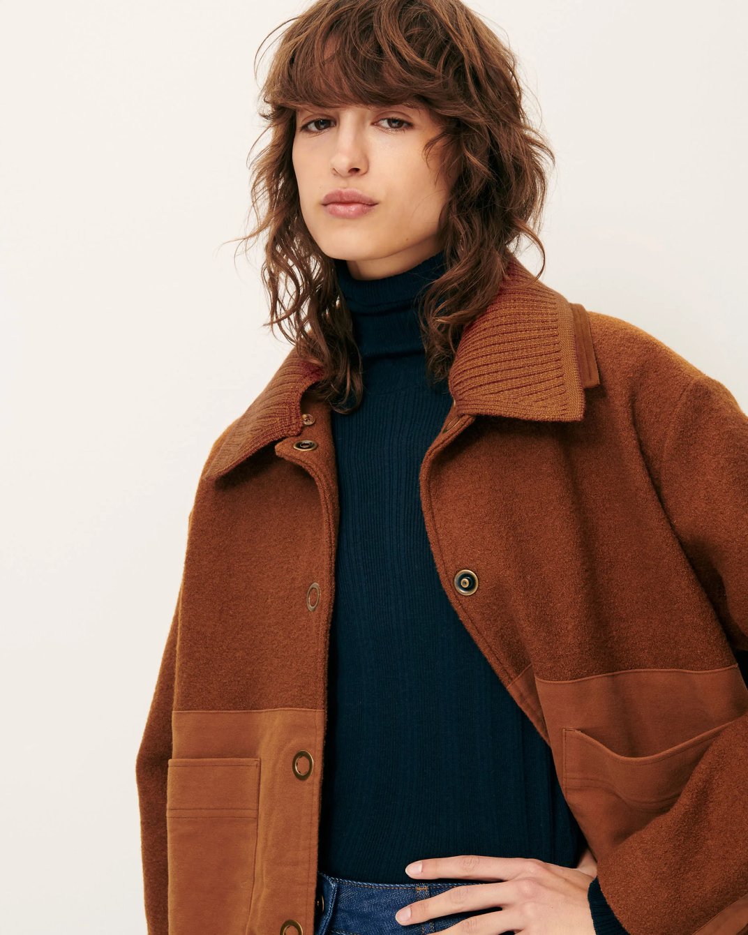 Chaqueta Paopao Sessùn. Chaqueta redondeada y elástica en lana hervida con paneles en sarga de algodón cepillada. Cuello acanalado con cierre de botones a presión.
