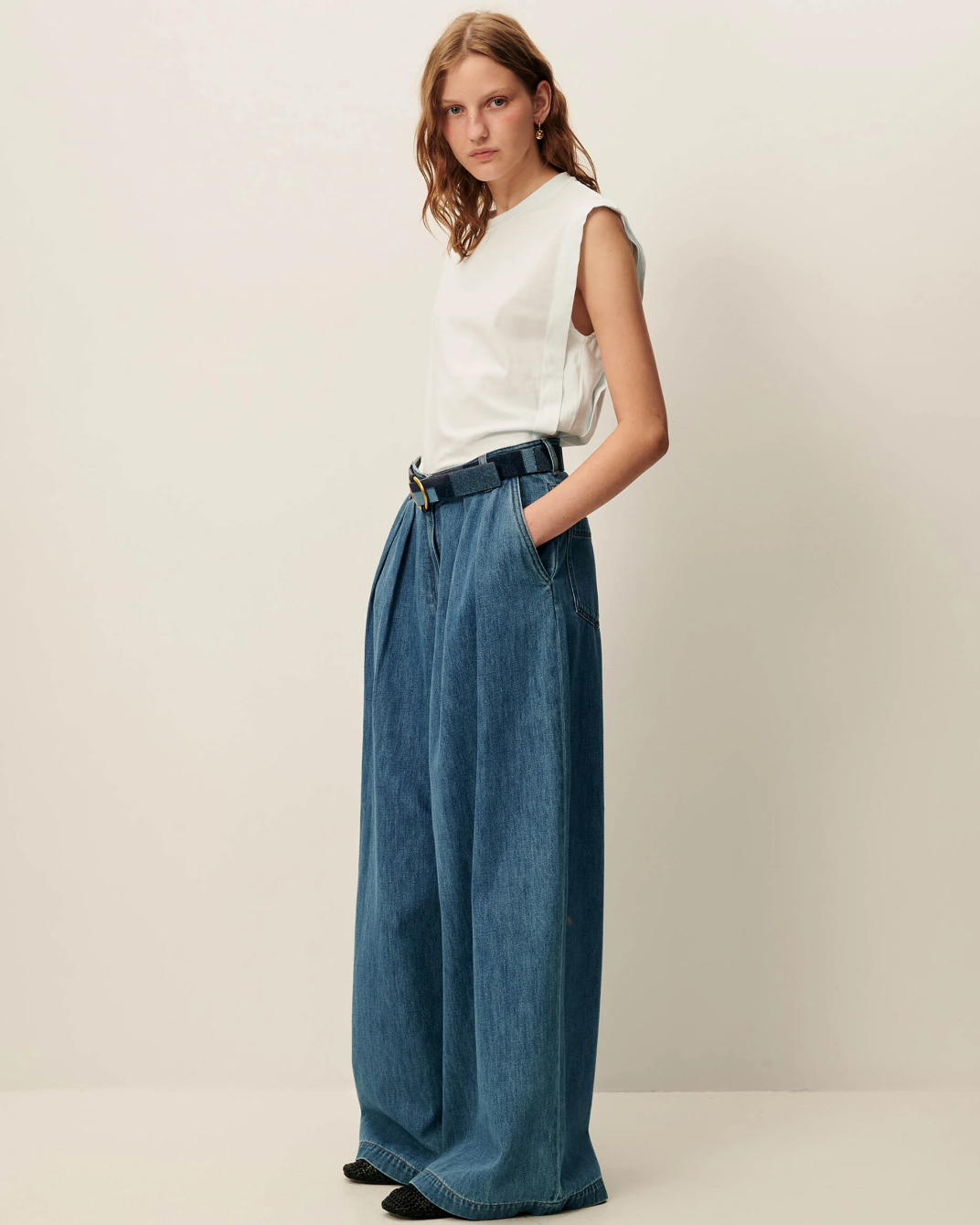 Vaquero Dalt Sessùn. Vaquero de talle alto con corte palazzo en sarga de algodón. En color azul denim.