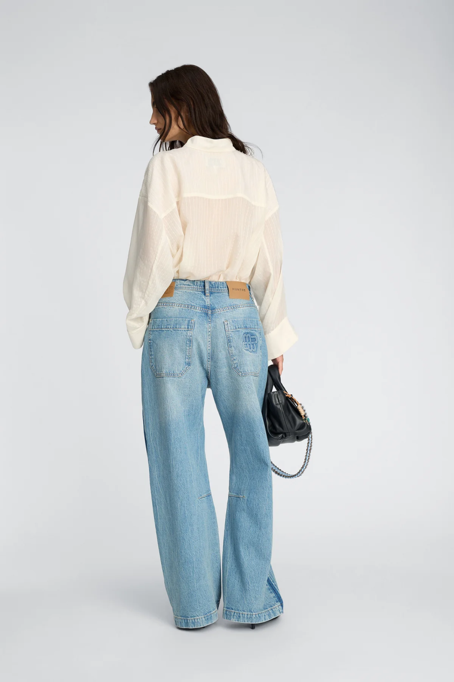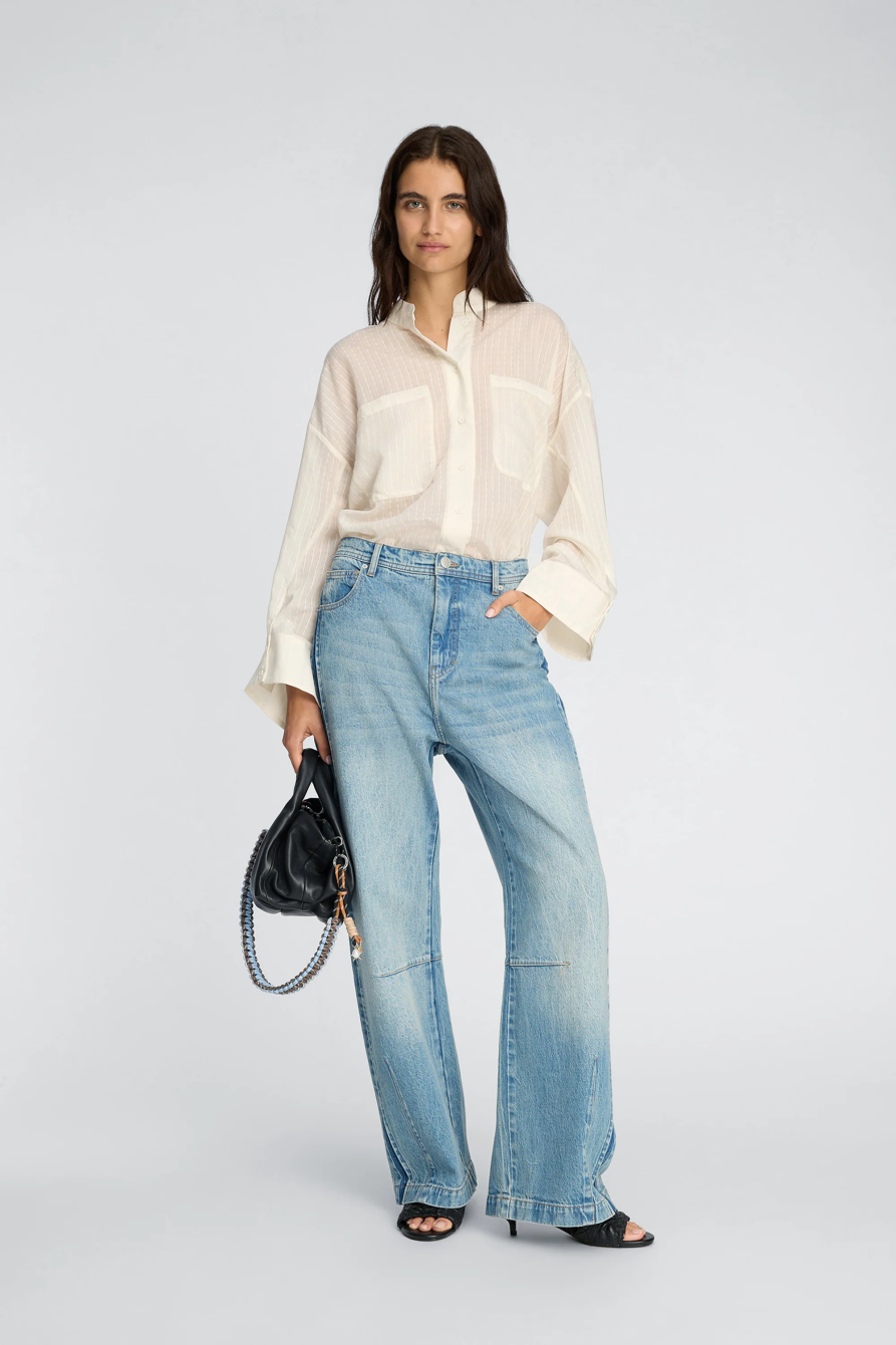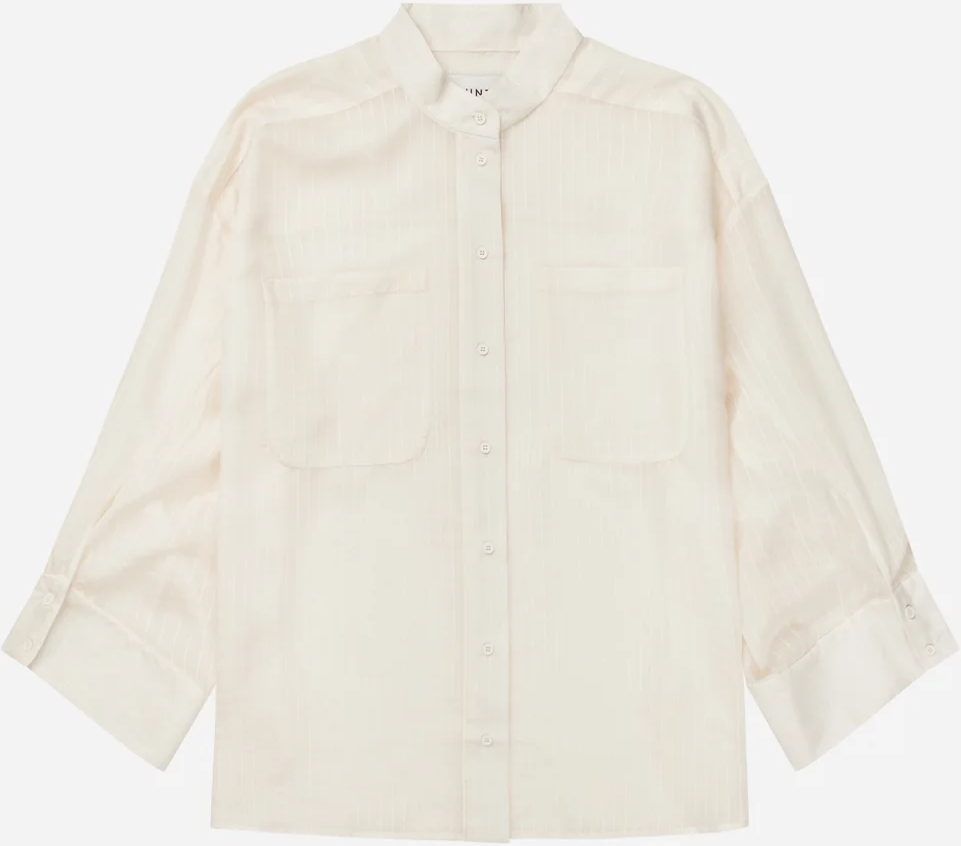 Camisa semitransparente de rayas finas. Cierre frontal abotonado. Dos bolsillos en el pecho. Mangas anchas con puños estructurados que definen la silueta.