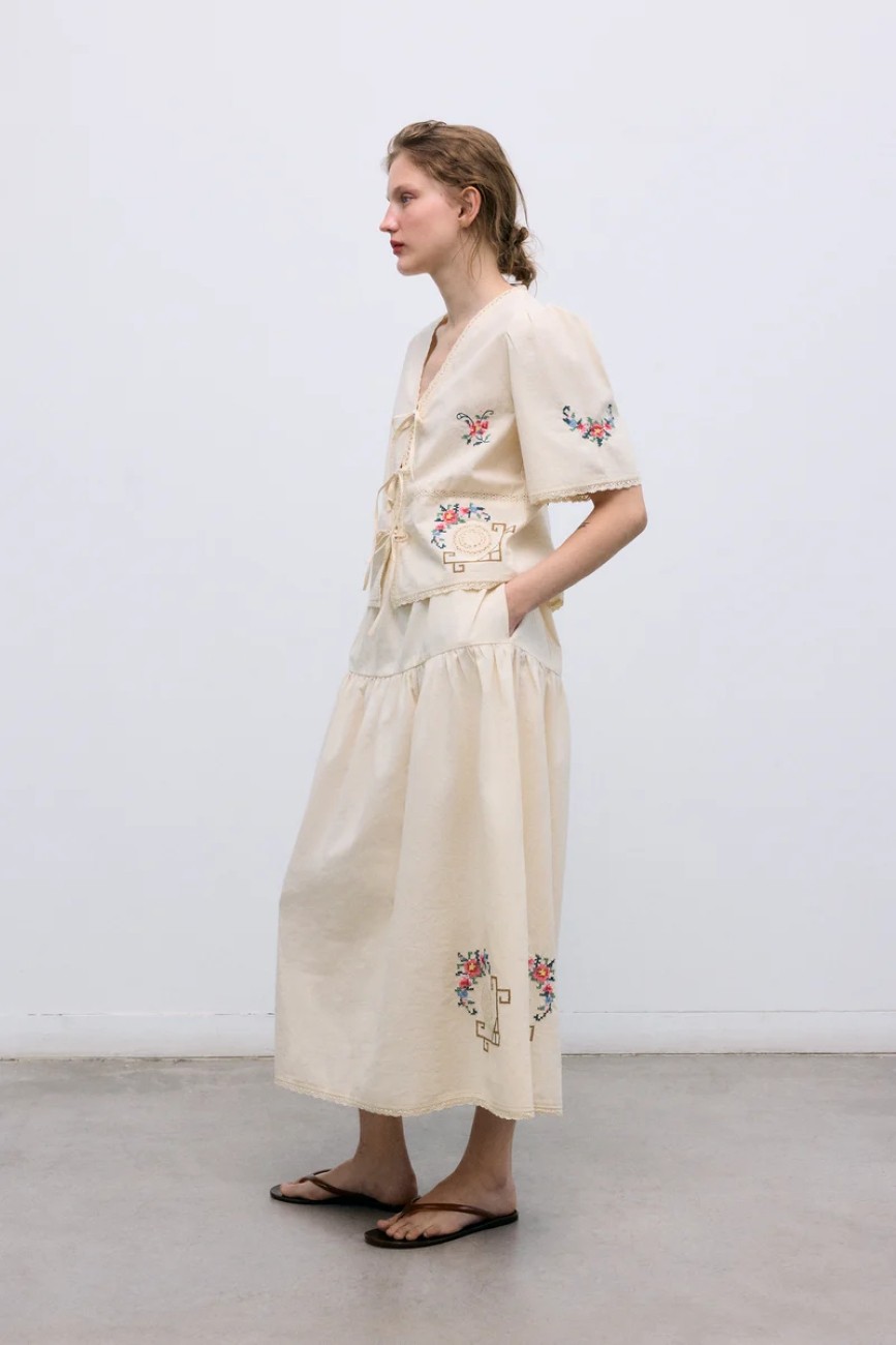 Vestido largo acampanado sin mangas, con cuello barco y acabado en algodón orgánico mercerizado. Su tejido en jersey aporta caída suave y comodidad.