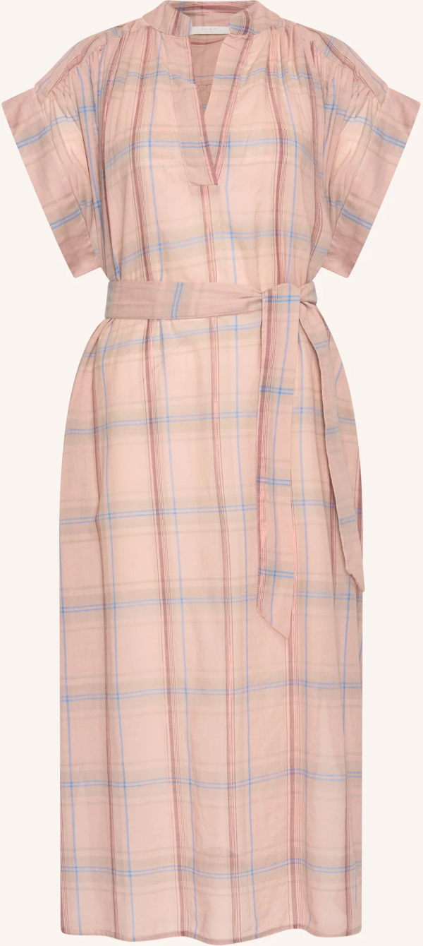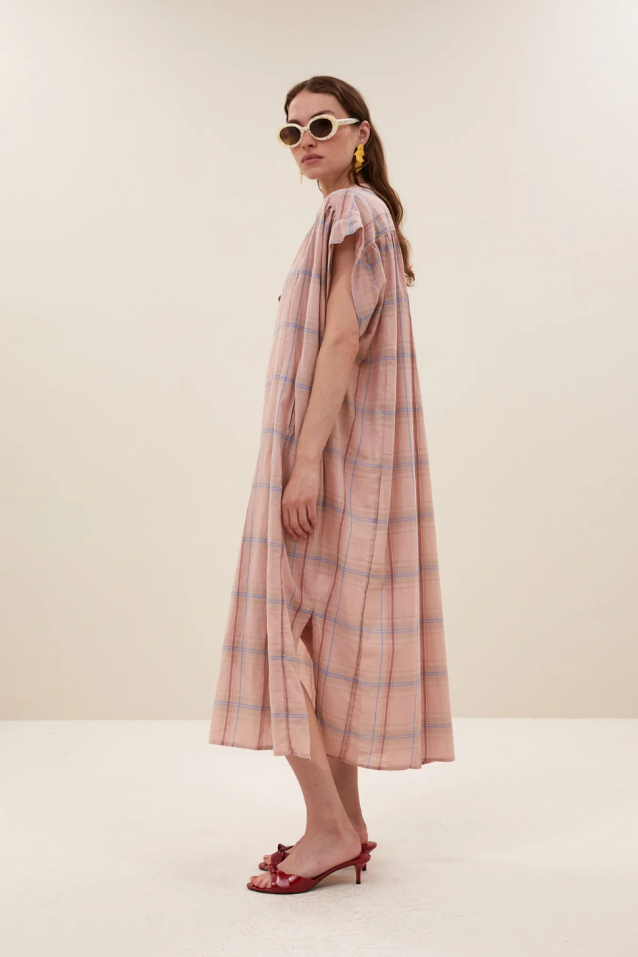 Vestido de corte cómodo y escote redondo, con estampado de cuadros y bolsillos laterales que aportan funcionalidad y detalle al diseño.