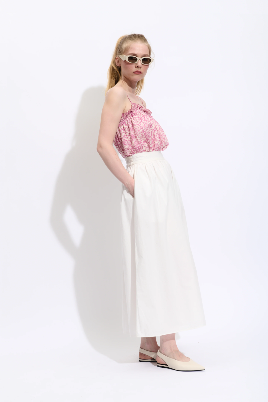 Chaleco de algodón suave con bordado floral exclusivo en colores vibrantes, que aporta un aire bohemio y lleno de personalidad. Presenta escote alto y frente abierto, con un ajuste elegante y estructurado que realza cualquier look. Una pieza única y atemporal, diseñada para aportar carácter y estilo.