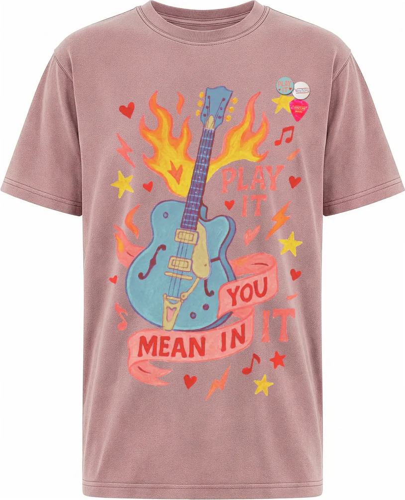 Camiseta de manga corta y corte recto largo con efecto lavado vintage y estampado en la espalda y al pecho. Detalle de pines al pecho extraibles.