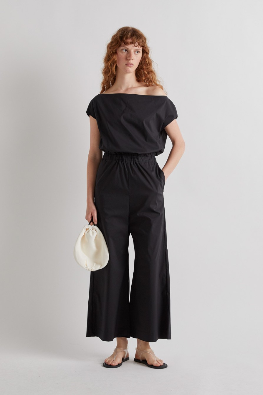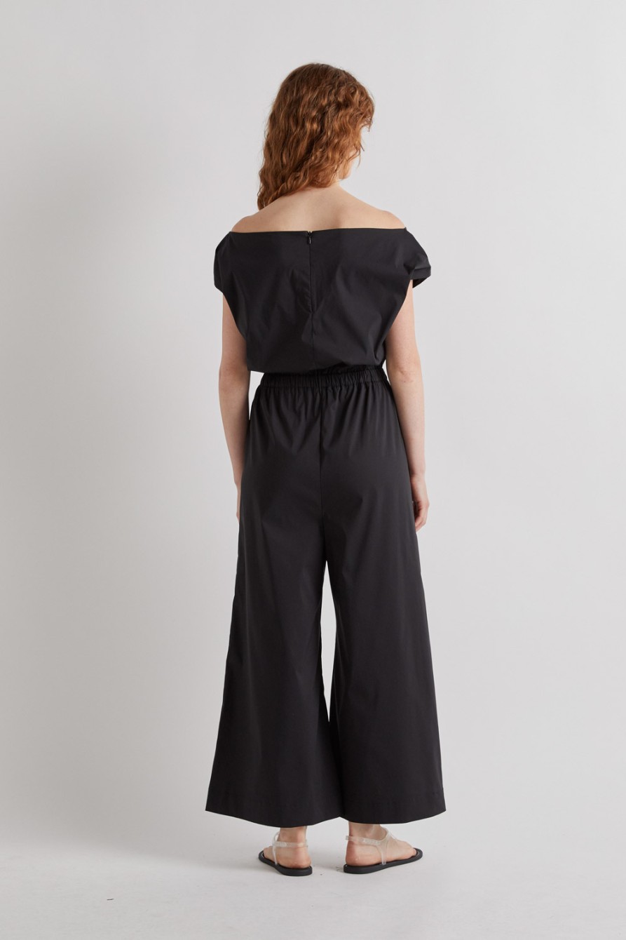 Pantalón blanco fluido con rayas verticales, goma en la cadera y bajo elástico estilo bombacho. Diseño ligero y cómodo con caída natural.
