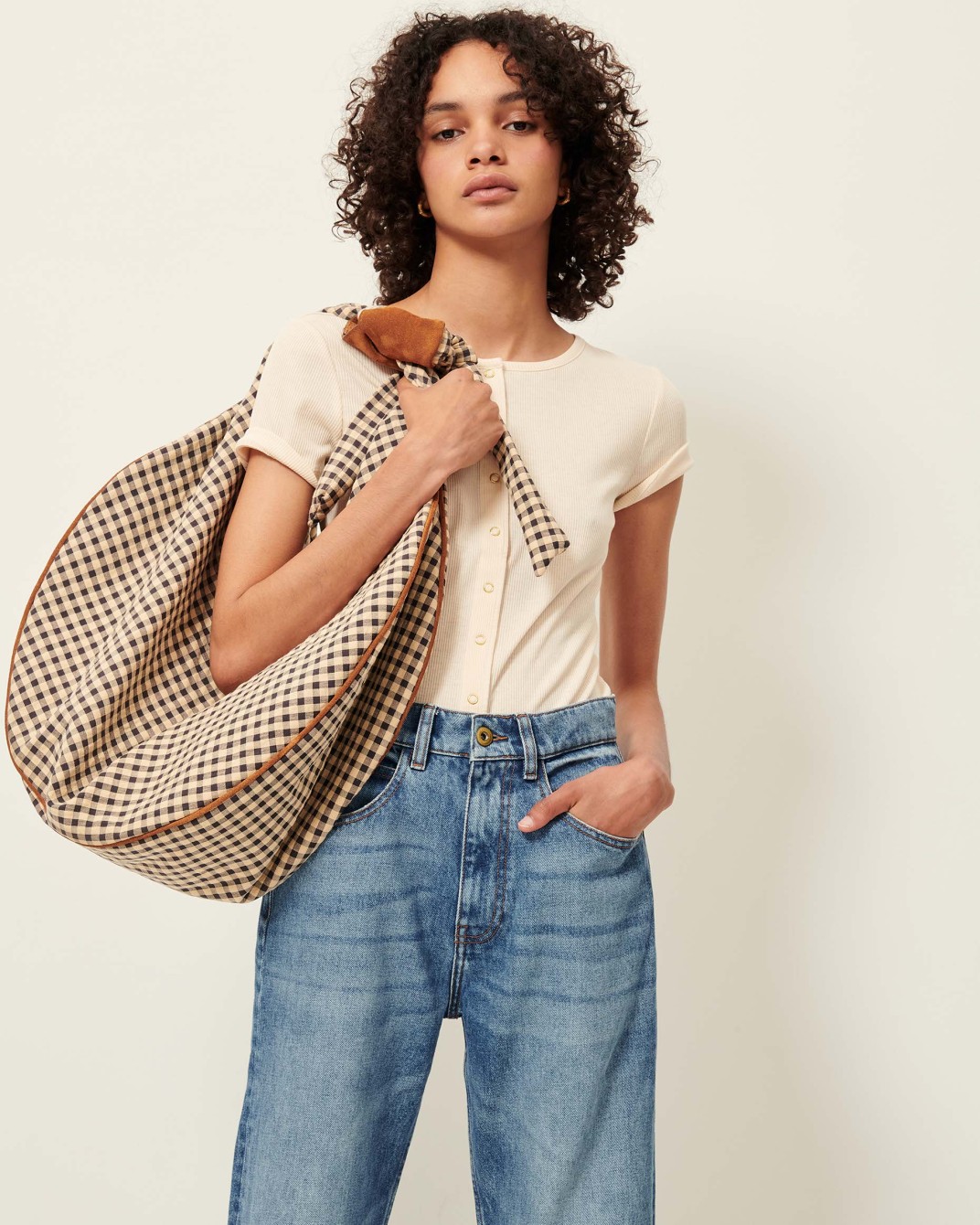 Pantalón de talle alto y pernera amplia en denim índigo lavado a la piedra, con pliegues frontales, bolsillos italianos y de parche traseros, cierre de botón y cremallera oculta.