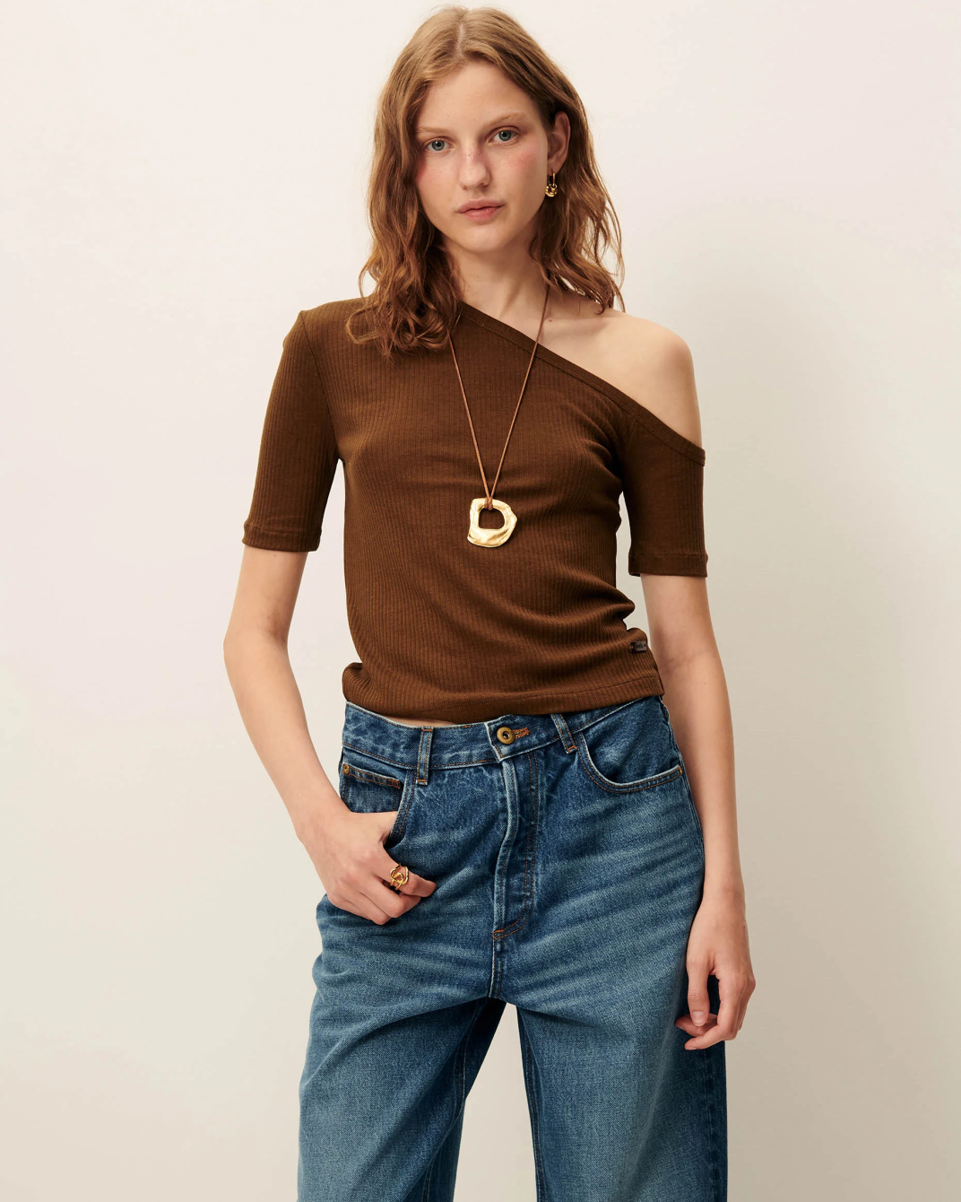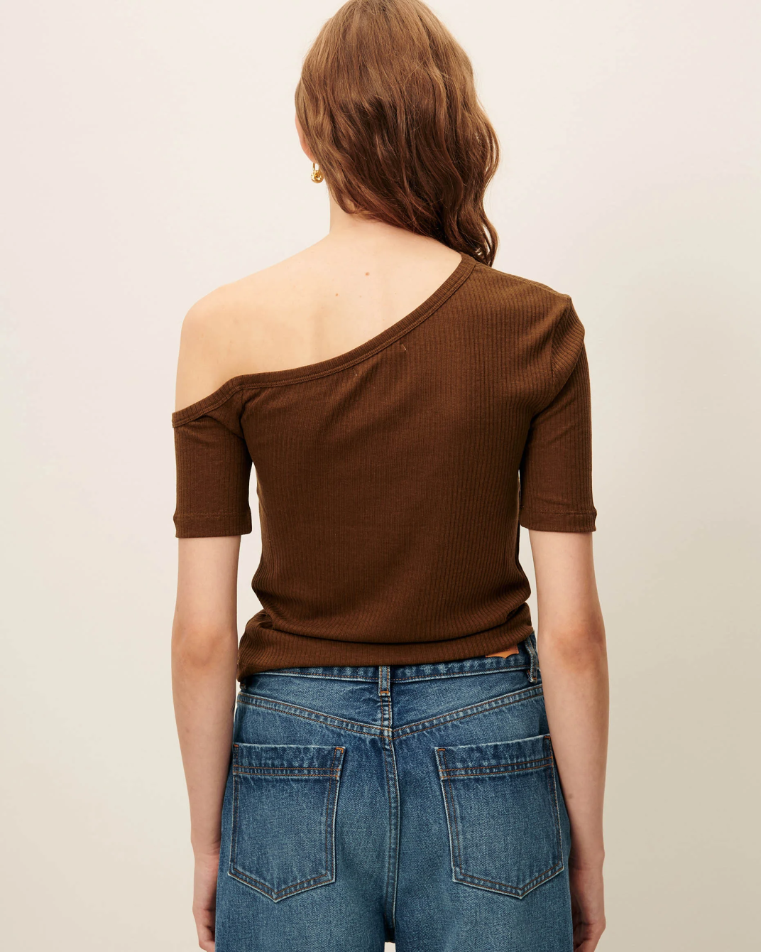 Camiseta corta ajustada y acanalada, con cuello redondo, manga corta y espalda abierta.