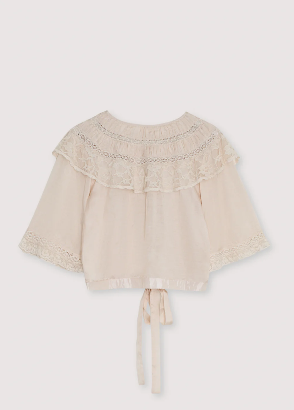 Blusa de viscosa con tacto sedoso y delicados detalles de encaje. Presenta abertura frontal con cierre de lazo, aportando un estilo refinado y femenino.