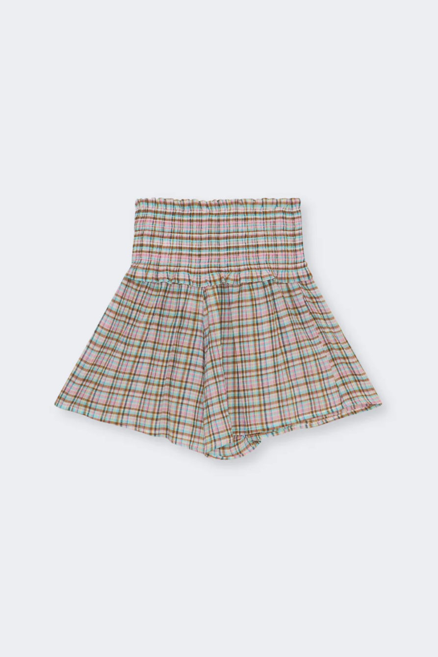 Blusa de algodón fino a cuadros con un diseño femenino y atemporal. Presenta detalles fruncidos en hombros y mangas, puños estrechos con botón y abertura frontal con lazo.