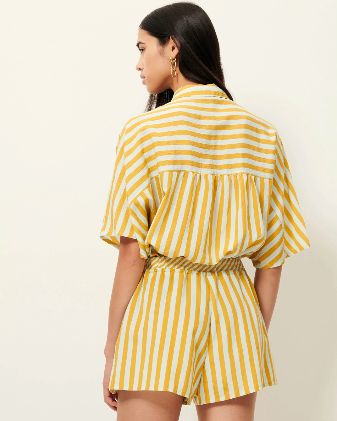 Polo corto en popelín de viscosa fluida con rayas anchas bicolor. Tapeta con botones tipo joya, manga corta con sisa raglán caída y panel fruncido en la espalda. Bajo elástico con cordones ajustables en los laterales.
