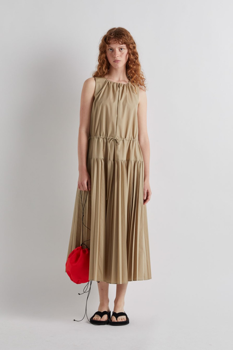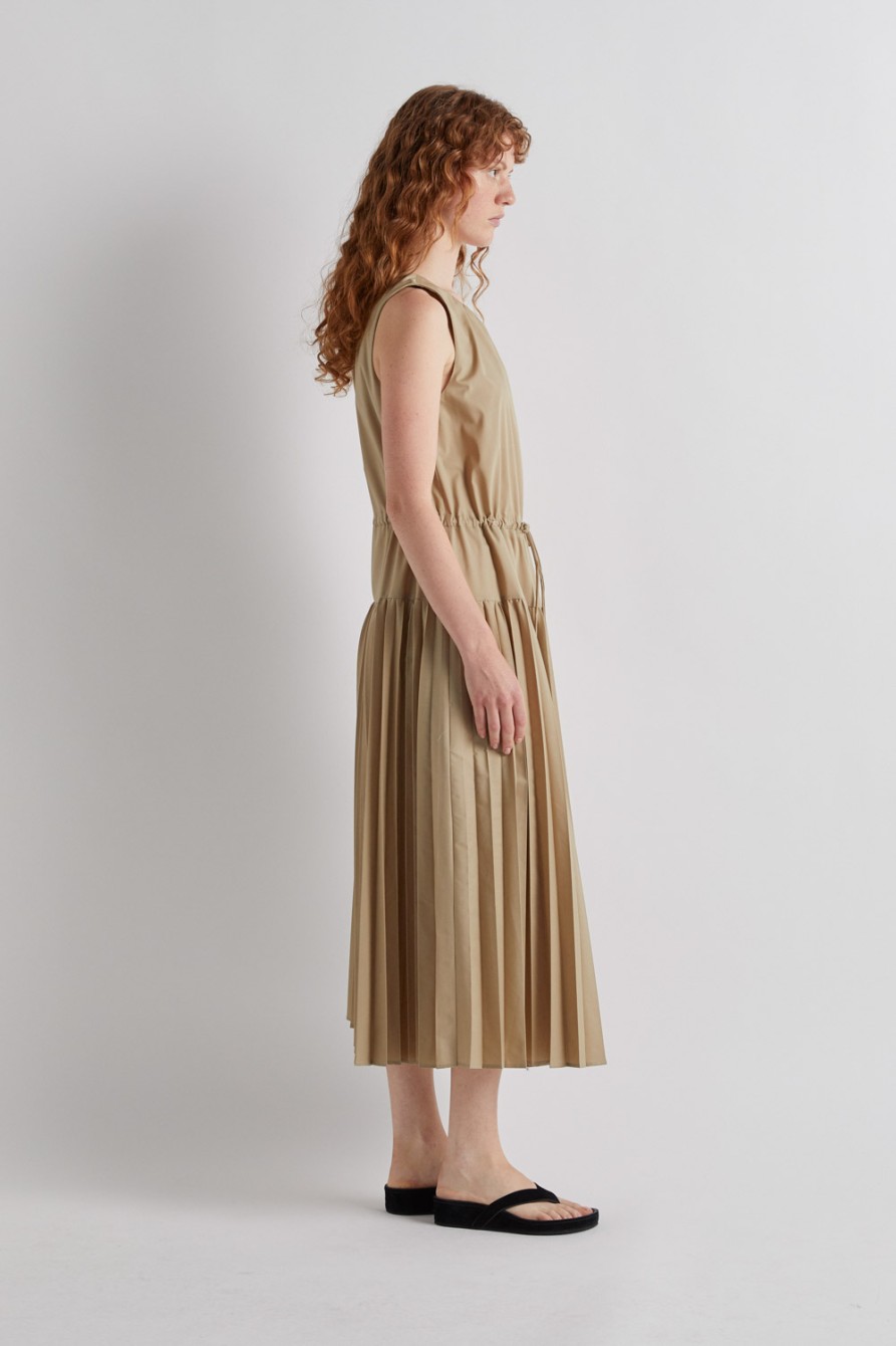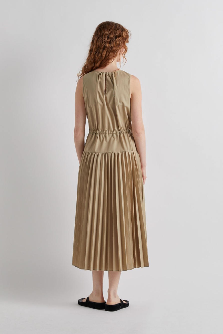 Vestido con falda plisada y parte superior lisa, cuerda regulable para ajustar la cintura y cierre en la espalda.