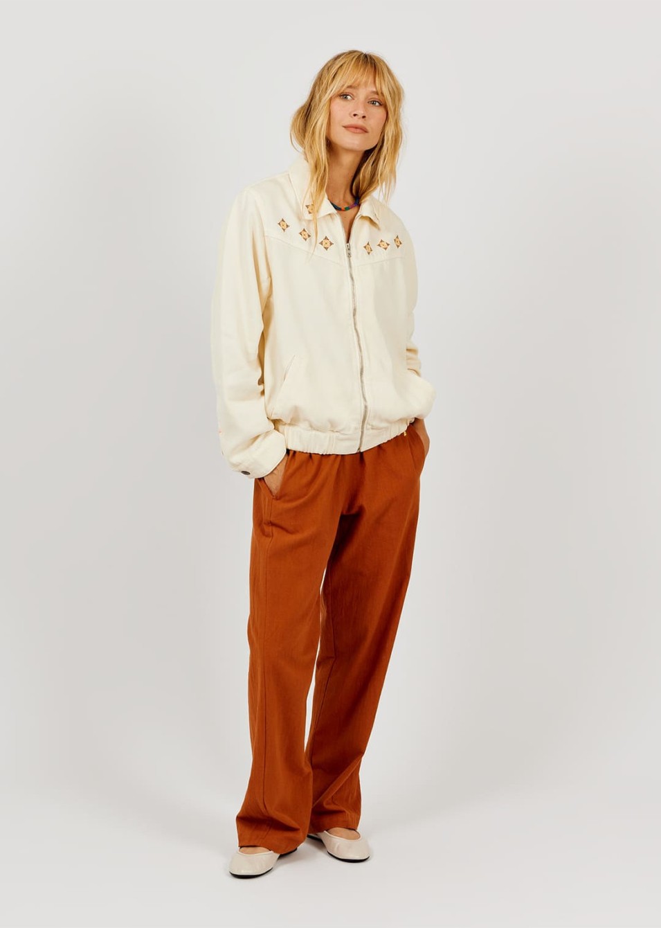 Pantalón de corte amplio y holgado en tejido muy fluido y con cintura ajustable y fruncida.